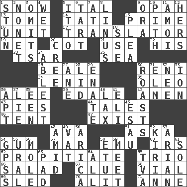 ACROSS 1. Overwhelm 5. Slanted text style (abbr.) 9. Brightly colored fish 13. Heavy book 14. Jacques of French films 15. A-one 16. A single undivided whole 17. Interpreter 19. Fish or hair follower 20. Small bed 21. Purpose 22. Part of HMS, perhaps 23. Russian ruler of old 25. Ocean 26. Memphis, Tenn. Street 30. Painter Guido (1575-1642) 34. Soviet premier 1918-24 35. Margarine 36. Toward shelter 39. Peak District village in England 42. So be it 43. Sliced desserts 44. Stories 46. Portable shelter 47. Be 48. Actress Gardner 51. "____ silly question..." 54. Chewing product 57. Spoil 58. Australian flightless bird 60. Big collection agency 62. Appease 65. Musical group of three 66. First course 67. A slight indication 68. Small bottle 69. Downhill vehicle 70. Came down and settled, as after flight 71. Singer Murray DOWN 1. Surprise greatly 2. Music written for nine 3. Leaves out 4. Soggy 5. "Tell ____ the Marines!" 6. Small pie 7. "One Day ___ Time" 8. "_ and Lucy" (Charlie Brown theme song) 9. Mouth or opening 10. Heart or essence 11. Mine, in Marseilles 12. Possessive pronoun 15. Entreaty 18. Compass dir. 20. Algonquian 24. Most capable 27. A saturated hydrocarbon 28. Hat (slang) 29. Maternal 30. Cooks with dry heat, as in an oven 31. Shade tree 32. Born 33. Electrically charged atom 36. Fitting 37. Falsehood 38. Car or cant ending 40. Not strict 41. Biblical high priest 45. He sold his birthright 48. Among 49. Large container 50. N. Chile seaport 52. Japanese brewing company 53. Believer in; advocate of (suffix) 54. Global Positioning Systems (abbr.) 55. Mountain range 56. Undercover agent 58. Needle holder 59. Confront 61. Flatfish 63. Writing tablet 64. 100% 65. Federal power corp.