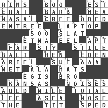 ACROSS 1. Basketball hoops 5. Sometimes accompanies a hiss 8. Eastern Standard Time (abbr.) 11. Part of Q.E.F. 12. Sharp remark 14. Teachers' org. 15. Rhinal 17. Algonquian 18. Wrote a lyric poem 19. Main course 21. Portable computer 23. "Barney Miller" actor Jack 25. Narrow board 26. Inactive volcano in Sicily 27. Snakelike fish 28. Fitting 31. At a great distance 33. Filthy place 35. Vertical member of a panel or frame 37. Indonesian resort city 38. Layer 40. Locale of original sin 41. Satellite of Uranus 43. Take to court 45. American Automobile Association (abbr.) 46. Fish or hair follower 47. Wing 50. Floor protectors 52. The front part of a cuirass 53. Sis' sibling 54. Sunflower state 56. Annoying sounds 61. Old (Scot.) 62. "Death on the ____" 65. "_____ Recall" 66. Area sheltered from the wind 67. At sea 68. Characteristic smell of wine 69. Definite Article 70. Teat (slang) 71. Moved rapidly DOWN 1. French philosopher Descartes 2. SW Asia republic 3. Vertical spar for supporting sails 4. Play the lead 5. English channel? 6. Rowing implement 7. Threatening words 8. Inside; within (prefix) 9. Ooze 10. Small amount or degree 13. Memphis, Tenn. Street 16. For fear that 18. Baseball player Mel 20. Immeasurably long periods of time 22. Friends 24. Pledge 26. One of the Great Lakes 28. Opera by Verdi 29. Entreaty 30. "___ Little Indians" 31. Conductor's collection 32. Set down 34. Consenting reply 36. Afternoon social gatherings 37. Prohibit 39. Unfeeling 42. Fails to keep up a pace 44. Merit 48. Climbing, woody, usually tropical vines 49. Help 51. A blast of a horn 52. Conclusion 54. Malaysian steamed pastry 55. Toward shelter 57. Charged particles 58. Discontinue 59. Comfort 60. Downhill vehicle 61. Keyboard modifier key 63. Luau accessory 64. Erode