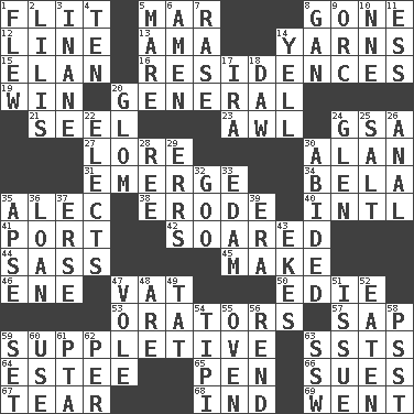 ACROSS 1. Secret move to avoid paying debts 5. Third mo. 8. Went 12. Actor's bit 13. Housemaid (var.) 14. Entertaining tales 15. Enthusiasm 16. Dwellings 19. Acquire through effort 20. Commissioned military rank 21. Stitch closed the eyes of (a falcon) 23. Leather borer 24. Girls' org. (abbr.) 27. Old wives' tales, e.g. 30. ____ Jay Lerner 31. Develop 34. Actor Lugosi 35. Actor Baldwin 38. Wear away 40. International (abbr.) 41. Sweet dark-red dessert wine 42. Flew 44. Backtalk 45. Create 46. Compass dir. 47. Large container 50. Singer Brickell 53. Speakers 57. Plant excrement 59. Supplementary 63. Fast planes 64. First name in cosmetics 65. Animal enclosure 66. Institutes legal proceedings 67. Pull into pieces 68. Working for oneself (abbr.) 69. Left DOWN 1. Soared 2. Ms. Damita and namesakes 3. Empty; void 4. Nine, plus one 5. Female horse 6. So be it 7. To erase 8. Separate the seeds from cotton 9. The grampus (Milton) 10. Compass dir. 11. Curvy letter 14. Shout 17. Lyricist Gershwin 18. Simpleton 20. Seize upon or latch onto something 22. Opts 24. Small, secluded valley 25. Table seasoning 26. Of or related to the anus 28. To separate or throw off 29. Blunders 30. Stayed 32. Thick or sticky substance 33. Dutch treat 35. Domed church section 36. Grant temporary use of 37. Celtic language 39. Period 43. Supplements with great effort 47. Short-tailed, large-bodied rat 48. "We ___ not amused" (Victoria) 49. Make lace 51. Come out of 52. Consumed 54. Native american tent (variation) 55. Baking chamber 56. Tear apart 58. Inconspicuous attention getter 59. Put into a specified state 60. Purpose 61. Parent Teacher Association (abbr.) 62. For each 63. Compass dir.