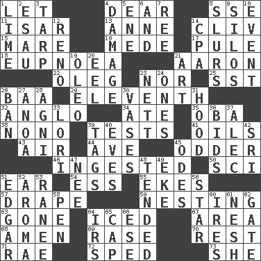 ACROSS 1. Allow 4. Letter starter 8. Compass dir. 11. Austrian river, tributary to the Danube 13. Singer Murray 14. 154 in Roman numerals 15. Female horse 16. Ancient Persian 17. Whine 18. Normal relaxed breathing 21. Composer Copland 22. Cassini of fashion 23. Or not 25. Fast jet (abbr.) 26. Sound made by sheep 29. Veterans Day date 32. White American of non-Hispanic descent 34. Had dinner 35. Chief or king in Benin or Nigeria 38. Words to Nanette 39. Trials 41. Lubricates 43. Atmosphere 44. "___ Maria" 45. More peculiar 46. Eaten 50. _-fi 51. Ewer handle 54. Curvy letter 55. Makes supply last 57. Window treatment 59. Nestling 63. Went 64. On the rocks 67. Type of rug 68. So be it 69. To erase 70. Repose 71. Actress Charlotte 72. Moved rapidly 73. A female animal or person DOWN 1. Welles in "The Third Man" 2. Son of Isaac 3. Canvas cover 4. Break 5. Compass dir. 6. Also 7. To separate or throw off 8. Runs notes together 9. Grain storage towers 10. Incident 12. Former U.S. Attorney General Janet 14. Accounting whiz (abbr.) 19. Butter sub 20. Snakelike fish 21. Tate display 23. Remaining after all deductions 24. Singles 26. Forbid 27. Small Philippine buffalo 28. Hindu god of fire 30. Flower holders 31. Parka part 33. Australian parrot (variant) 36. Auction offers 37. Actor Baldwin 39. Labels 40. Nights before holidays 42. _ Lanka 45. Lyric poems 47. Born 48. Looked after 49. Make supply last 51. _ Allan Poe 52. Odor 53. The wife of a rajah (variant) 56. Play the lead 58. Animal enclosure 60. Angers 61. Tender 62. Yard entry 64. Big collection agency 65. Head covering 66. Compass dir.