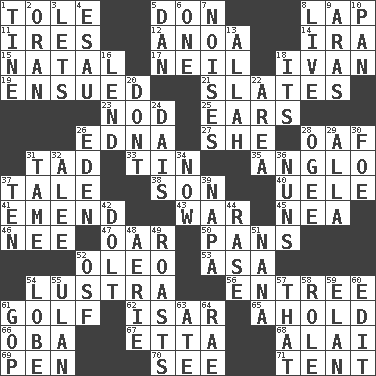 ACROSS 1. Lacquered or enameled metalware 5. Spanish title 8. Infant locale 11. Angers 12. Small Philippine buffalo 14. Retirement account (abbr.) 15. Brizilian seaport 17. Famous astronaut Armstrong 18. "Terrible" tsar 19. Took place subsequently 21. Chalkboards 23. Allow head to fall sleepily 25. Hearing organs 26. Pulitzer Prize-winning author Ferber 27. A female animal or person 28. Clumsy lout 31. Bit 33. Metal container 35. White American of non-Hispanic descent 37. Lie 38. Male offspring 40. Ubangi River tributary 41. Make improvements or corrections to 43. Armed conflict 45. Teachers' org. 46. Born 47. Rowing implement 50. Zero-star reviews 52. Butter sub 53. White ___ sheet 54. A period of five years 56. Main course 61. Eighteen holes 62. Austrian river, tributary to the Danube 65. Hold, grip (Informal) 66. Chief or king in Benin or Nigeria 67. Singer James 68. Jai ____ 69. Fenced enclosure 70. Observe 71. Portable shelter DOWN 1. Prong on a fork 2. NW Algerian seaport 3. Allows 4. He sold his birthright 5. Daniel's nick name 6. Single 7. Annoying sounds 8. Moving, as bait 9. Ancient river in northeast Turkey 10. Baking dish 13. Assad's deity 16. Grant temporary use of 18. It is 20. Do not 22. Type of rug 24. Raised platform 26. Genesis locale 28. Double curve, resembling the letter S 29. Silent film actress Nazimova 30. Enemy 31. Docile 32. Toward shelter 34. At this time 36. Religious women 37. "___ Little Indians" 39. California wine valley 42. Dunce 44. Raze (variant) 48. Nest on high 49. Ridicules or criticizes harshly 51. Nanny 52. Order of Saint Francis (abbr.) 54. Ear part 55. ____ Bator 57. Not this but _ 58. Hero or heavy, e.g. 59. Enthusiasm 60. Prepare for publication 61. Grand Old Party 63. Had dinner 64. Actress Charlotte