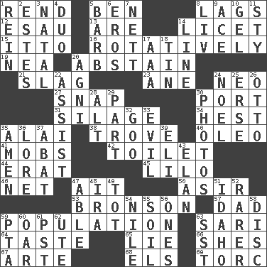 ACROSS 1. Tear apart 5. Benjamin's nick name 8. Falls behind 12. Son of Isaac 13. "We ___ not amused" (Victoria) 14. It is permitted: Lat. 15. "Tell ____ the Marines!" 16. Producing rotation 19. Teachers' org. 20. Refrain by choice 21. Volcanic refuse 23. One (Scot) 24. Modern: prefix 27. Fastener 30. Sweet dark-red dessert wine 31. Fodder prepared in a silo 34. Behest 35. Mountain range southwest of Kyrgyzstan 38. Collection of objects 40. Butter sub 41. Crowds into 42. Rest room 44. Part of Q.E.F. 45. _ and Stitch 46. Fish or hair follower 47. Small island 50. SW Saudi Arabia district 53. "Death Wish" actor 57. Male parent 59. Census information 63. Indian skirt 64. Clothes sense 65. Falsehood 66. "______ My Girl" (Turtles hit) 67. Johnson of "Laugh-In" 68. Raised railways 69. Torque (variant) DOWN 1. It's straight from the horse's mouth 2. _____ Park, CO 3. Relating to or accompanying birth 4. Superhero pair 5. Sharp remark 6. Greek god of love 7. Remaining after all deductions 8. 54 in ancient Rome 9. Adept person 10. Set 11. Filthy place 14. Actor's bit 17. American Automobile Association (abbr.) 18. Metal container 20. Hindu god of fire 22. Aid 24. Christmas carol 25. Celtic language 26. "Beetle Bailey" pooch 28. Keyboard modifier key 29. Component 30. Pictures 32. Thick or sticky substance 33. Morally bad or wrong 35. So be it 36. Old wives' tales, e.g. 37. Blind as ____ 39. Biblical high priest 43. Flair 47. Competent 48. Lyricist Gershwin 49. Small child 51. Potato state 52. Less widely known 54. "Death on the ____" 55. Earth 56. Singles 58. Compact _ 59. Parent Teacher Assoc. 60. Rowing implement 61. Pacific Standard Time (abbr.) 62. Shoshoni 63. Fast jet (abbr.)
