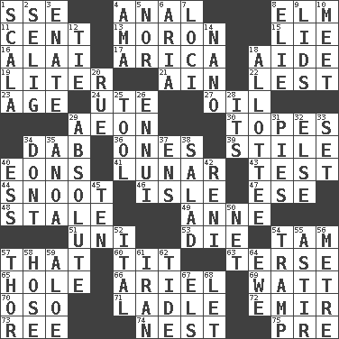 ACROSS 1. Compass dir. 4. Of or related to the anus 8. Shade tree 11. Penny 13. Person of subnormal intelligence 15. Untruth 16. Mountain range southwest of Kyrgyzstan 17. N. Chile seaport 18. Assistant 19. 61 cubic inches 21. The 18th letter of the Arabic alphabet 22. For fear that 23. Ripen 24. Shoshoni 27. Petroleum 29. A really long time 30. Drinks excessively 34. Small moist lump or mass 36. Washington bills 39. Vertical member of a panel or frame 40. Immeasurably long periods of time 41. Type of eclipse 43. Trial 44. Snout, nose 46. Capri or Wight 47. Compass dir. 48. Showing deterioration from age 49. Queen of England 1702-14 51. University (slang) 53. Expire 54. Scottish cap 57. Not this but _ 60. Teat (slang) 63. Laconic 65. Hollow 66. Satellite of Uranus 69. Electrical Unit 70. Bear (Spanish) 71. Dipping utensil 72. Arab leader 73. To sift 74. A home for chicks 75. Before (prefix) DOWN 1. Any of the three canals of the cochlea 2. Major League Baseball Commissioner Bud 3. Maternal 4. Nursemaid (var.) 5. Not either 6. Roberta Peters solo 7. Venues 8. Writer Wiesel 9. Hats (slang) 10. Confront 12. Neckwear 14. Billionth: prefix 18. One to whom something is allotted 20. Regret 25. Instrument 26. World-weariness 28. ___ a Wonderful Life 29. Utter; complete 31. Sliced desserts 32. Otherwise 33. Put into a specified state 34. Do not 35. Small Philippine buffalo 37. Followers of ems 38. Vegetable dish 40. Double-curved letter 42. Painter Guido (1575-1642) 45. Nine, plus one 50. Fish or hair follower 52. Slanted text style (abbr.) 54. _____ steamer (cargo ship) 55. Having gotten out of bed 56. Distance measurement (Brit.) 57. Son of Odin 58. Stockings 59. _ vera 61. SW Asia republic 62. Event that recurs at intervals 64. She-sheep 67. Raised railways 68. Allow