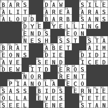 ACROSS 1. Taverns 5. Obsolete 8. Drop; flow; fall 12. Set down 13. Type of rug 15. Caspian sea tributary 16. Verbally 18. Sharp remark 19. Without 20. Color 22. Crying or shouting loudly 24. Conclusions 26. Period of immesurable duration 27. Soft 28. Fast jet (abbr.) 29. R.R. building 32. Naughty child 35. Collude with 37. Direct toward a target or goal 38. Immeasurably long periods of time 39. Pass on 40. "You Light Up My Life" star Conn 41. "___ Maria" 42. Transmit 43. On the rocks 44. Morning condensation 45. It would 46. Greek god of love 49. Or not 50. Monthly bill 51. Player piano 55. Environmental prefix 56. Backtalk 57. Auction offers 59. Bert's buddy 63. Spanish pot 64. Nights before holidays 65. False hair 66. Sew up the eyelids of hawks and falcons 67. Compass dir. 68. Comedian Laurel of Laurel & Hardy DOWN 1. Sound made by sheep 2. 100% 3. _ de Janeiro 4. SAT takers 5. Small moist lump or mass 6. Like ___ of sunshine 7. Past tense of be (plural) 8. Indian antelope 9. SW Asia republic 10. Long (Scottish) 11. Curvy letter 14. Most capable 17. Unit of force 21. Begley and Asner 23. Car dealer's back yard 25. Cast a shadow over 28. Sowing specialist 29. Ketch in the Levant 30. Event that recurs at intervals 31. Among 32. Necklace unit 33. Be footloose 34. Afresh 36. Storage container 40. What propaganda does 42. Disco prop 45. Electrically charged atom 47. Portuguese money of account (variant) 48. Single time 49. Relating to the nose 51. Light colored 52. Small island 53. Not recorded 54. An important port of Yemen 56. Distress signal 58. Compass dir. 60. Fish or hair follower 61. Call ___ day 62. Car or cant ending