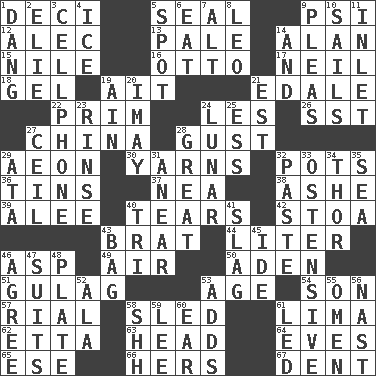 ACROSS 1. Tenth: prefix 5. Lick closed 9. Air pressure measure (abbr.) 12. Actor Baldwin 13. Diluted with white 14. Actor Alda or Thicke 15. Mediterranean tributary 16. "Beetle Bailey" pooch 17. Famous astronaut Armstrong 18. Set 19. Small island 21. Peak District village in England 22. Demure 24. French article 26. Fast jet (abbr.) 27. Large country 28. Abrupt rush of wind 29. Age 30. Entertaining tales 32. Plant holders 36. Metal containers 37. Teachers' org. 38. American tennis player Robert 39. Toward shelter 40. Lacerates 42. Portico 43. Naughty child 44. 61 cubic inches 46. Viper 49. Atmosphere 50. An important port of Yemen 51. Russian prison camp 53. Grow older 54. Male child 57. Monetary unit of Yemen 58. Downhill vehicle 61. Pale green bean 62. Singer James 63. Froth on beer 64. Nights before holidays 65. Compass dir. 66. Possessive pronoun 67. Gouge DOWN 1. Mild oath, euphamism for damn 2. Writer Wiesel 3. Portable communications device 4. Frozen water 5. Specific locale 6. Erode 7. The first octave above the treble staff 8. Lion 9. Entreaties 10. Moves on water 11. An arm off of a larger body of water 14. Added to 19. The 18th letter of the Arabic alphabet 20. "If ____ say so..." 21. Eastern Standard Time (abbr.) 23. Wash lightly 24. Type of eclipse 25. Curvy letter 27. To provide with a ceiling 28. Relatively large 29. _ moment's notice (2 wds.) 31. Approach 32. Thick mixture 33. Clearly or manifestly demonstrative 34. Son of Odin 35. Ocean 40. Three (prefix) 41. Volcanic refuse 43. Paper or plastic container 45. Binary compound 46. Match 47. Sets or collections 48. Food holder 52. In the manner of 53. Does sums 55. Sign of things to come 56. Political cartoonist Thomas 58. Quiet! 59. Area sheltered from the wind 60. Ewer handle 61. Directed