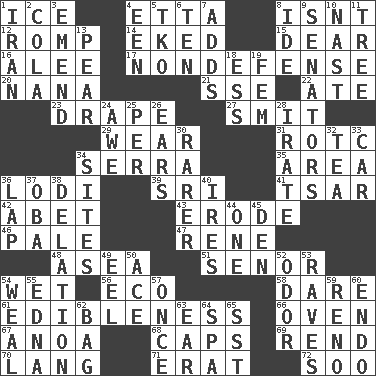 ACROSS 1. Frozen water 4. Singer James 8. Is not 12. Play 14. Made supply last 15. Letter starter 16. Toward shelter 17. Unrelated to defense, as in spending 20. Grandmother 21. Compass dir. 22. Had dinner 23. Window treatment 27. Stricken, poetically 29. Put on (as clothing) 31. College mil. group 34. Father Junipero _ 35. Type of rug 36. Farming town in central California 39. Indian title of respect (Mr.) 41. Russian ruler of old 42. Collude with 43. Eat (away) 46. Light colored 47. French philosopher Descartes 48. At sea 51. Sir (Sp.) 54. Dripping 56. Environmental prefix 58. Have the gumption 61. The property of being fit to eat 66. Baking chamber 67. Small Philippine buffalo 68. Balmoral and tarboosh 69. Tear apart 70. Austrian-born American filmmaker Fritz 71. Part of Q.E.F. 72. "Barney Miller" actor Jack DOWN 1. SW Asia republic 2. Root beer relative 3. Make improvements or corrections to 4. Car or cant ending 5. Ring climax 6. "___ Little Indians" 7. Does sums 8. Binary compound 9. Elected representatives 10. Political cartoonist Thomas 11. Woody plant 13. Lightbulb-shaped fruit 18. Curvy letter 19. Opposite of masc. 24. Deep reverence 25. For each 26. Hearing organs 28. Feeling or showing extreme anger 30. More uncommon 32. Afternoon social gathering 33. Auto 34. Settings 36. Pet locale 37. Chief or king in Benin or Nigeria 38. Accusation by an informer 40. Angers 44. Single 45. Lair 49. Snakelike fish 50. Adept person 52. Aroma 53. All-night dance parties 54. Welt 55. Pulitzer Prize-winning author Ferber 57. Single time 59. Former U.S. Attorney General Janet 60. Inside; within (prefix) 62. Container for groceries 63. Ewer handle 64. Health resort 65. Fast jet (abbr.)