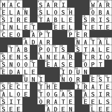 ACROSS 1. Apple computer (short form) 4. Indian skirt 8. Armed conflict 11. Liveliness 13. Make a splashing sound 15. Chief or king in Benin or Nigeria 16. Title for a man of rank and authority 17. Eating place 18. Indian titles of respect 19. An arm off of a larger body of water 21. Snakelike fish 22. Wig 23. Corporate head (abbr.) 24. Fitting 27. For each 29. The sixth month of the Jewish calendar 30. Brizilian seaport 34. Keyboard key 36. Cooking vessels 39. Having lost freshness 40. Elected reps. 41. Approach 43. Musical group of three 44. Snout, nose 46. Comfort 47. Elect 48. Peak District village in England 49. Goddess of spring and wife of Bragi 51. Single; one (prefix) 53. Or not 54. Eastern Standard Time (abbr.) 57. Religious group 60. Definite Article 63. Feeling or showing extreme anger 65. Medicinal plant 66. Ancient Roman robes 69. SW Saudi Arabia district 70. Be seated 71. Declaim 72. Snakelike fish 73. Observe 74. Arabian gulf 75. Area sheltered from the wind DOWN 1. Mesonic 2. Place in a line 3. Monte _, Las Vegas Hotel/Casino 4. Fast jet (abbr.) 5. Wing 6. Loose flowing garment 7. Small island 8. Had on 9. "This won't hurt ____!" 10. To erase 12. Born 14. Aid 18. Ski resort town in Vermont 20. Bit 25. Dad 26. Marketplace scale 28. Followers of ems 29. Utter; complete 31. Canvas cover 32. Set down 33. Lion 34. Watch over 35. Small Philippine buffalo 37. Beverage made from leaves 38. Indian antelope 40. Compass dir. 42. Do over again 45. "___ Little Indians" 50. RI univ. 52. "Tell ____ the Marines!" 54. Artist's stand 55. Vertical member of a panel or frame 56. Laconic 57. Backtalk 58. Writer Wiesel 59. ____ d'Azur (French Riviera) 61. Israeli folk dance 62. Mild oath 64. Actress Charlotte 67. Had dinner 68. Elected rep.