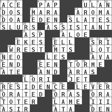 ACROSS 1. Adept person 4. Infant food 7. Uhlan (variant) 11. Two (Sp.) 12. Hindu Mythology: god of death 13. Scent 14. ___ good deed 15. Paradise 16. Chalkboards 17. Disparaging remarks 19. Aide 21. Cleo's killer 23. _ vera 24. Supplements with great effort 25. Pipe bend 26. Indian title of respect (Mr.) 29. Obtain by seizing forcibly or violently 30. Mountains (abbr.) 31. Car dealer's back yard 32. Modern: prefix 33. French article 34. Actress Gardner 35. Conclusion 36. Car or cant ending 37. Singer Mel 40. Had dinner 41. Also 42. Caspian sea tributary 43. Australian parrot (variant) 45. Passenger plane 46. Dwelling 51. Prying instrument 55. Spoke pompously 56. Mouths or openings 58. Mouth or opening 59. Carrier 60. Unable to walk 61. One more than two 62. SW Saudi Arabia district 63. "One Day ___ Time" 64. Lair DOWN 1. Does sums 2. Calm and collected 3. He sold his birthright 4. Writing tablet 5. Length times width 6. Baking dishes 7. A salt of uric acid 8. Globular water bottle used in Asia 9. So be it 10. Political cartoonist Thomas 12. Makes clutter 13. In addition 16. Beverly of Met fame 18. Libertine 20. Table seasonings 22. Pacific Standard Time (abbr.) 24. Wear away 25. Make improvements or corrections to 26. Hits or strikes with great force 27. Be footloose 28. Call ___ day 29. Gone 32. Teachers' org. 33. Soviet premier 1918-24 36. Having ears or earlike features 37. _ Mahal 38. Threatening words 39. Assign a rank or rating to 43. 61 cubic inches 44. Baltic tributary 46. Roll call or roster of names 47. Greek god of love 48. Suttee (variant) 49. Root beer relative 50. Part of Q.E.F. 52. Empty area or space 53. One of the Great Lakes 54. Water falling in drops from the sky 57. Wet nurse (var.)
