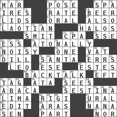 ACROSS 1. Spoil 4. Airs 8. Health resort 11. Angers 13. Pace 14. Fermented drink made from hops 15. Flaplike coverings 16. Of the mouth 17. In addition 18. Of or relating to Laos or its people 21. Rings 22. Stricken, poetically 23. Tax preparer (abbr.) 25. Compass dir. 26. Double-curved letter 29. Without tonality 32. Annoyingly loud 34. Single 35. Large container 38. Deli pickle 39. Before Barbara or Clara 41. Blunders 43. Lion 44. Compass dir. 45. _____ Park, CO 46. Sass 50. Newt 51. Label 54. _ moment's notice (2 wds.) 55. Perceives with the eye 57. Phillipine bananalike plant 59. French poetic form 63. Pale green bean 64. Swiss mountan, "Queen of the Mountains" 67. Mountain range 68. Prepare for publication 69. Caspian sea tributary 70. Nanny 71. Elected rep. 72. Piece 73. And not DOWN 1. Place where flour is made 2. Roberta Peters solo 3. Make new 4. Right away 5. Boat paddle 6. R.R. building 7. Snakelike fish 8. Exchanges for money 9. Mexican monetary units 10. Came up 12. Fast planes 14. Sound made by sheep 19. "If ____ say so..." 20. Small island 21. Actor Linden 23. Patter 24. Entreaty 26. Conclusion 27. The visible part of the earth's surface 28. Filth; sediment 30. Music written for nine 31. Jacques Cousteau's middle name 33. Messy guy 36. Johnson of "Laugh-In" 37. Unclean, religiously 39. Religious group 40. "____ silly question..." 42. Fast jet (abbr.) 45. Makes supply last 47. Auto club (abbr.) 48. Help 49. Area sheltered from the wind 51. Falsehoods 52. Tolerate 53. Homeless child 56. Make senseless or dizzy 58. Feline 60. SW Asia republic 61. Billionth: prefix 62. Having or resembling wings 64. Reproach for some lapse or misdeed 65. Retirement account (abbr.) 66. Slender fish