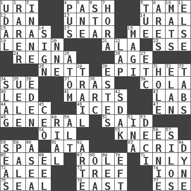 ACROSS 1. RI univ. 4. Romantic infatuation 8. Not wild 12. Daniel's nick name 13. To (old English) 14. Mountain range 15. Ancient river in northeast Turkey 17. Shrivel 18. Confronts 19. Soviet premier 1918-24 21. Chicken ___ king 23. Compass dir. 24. Canadian anthropologist Darnell 26. Mature 28. Remaining after all deductions 30. Curse 34. Institute legal proceedings 37. Mouths or openings 39. Root beer relative 40. Directed 41. Shops 43. Experiment locale 44. Actor Baldwin 46. On the rocks 47. Followers of ems 48. Commissioned military rank 51. Stated 54. Lubricate 55. Leg joints 58. Health resort 61. "One Day ___ Time" 63. Sour-tasting 65. Artist's stand 67. Hero or heavy, e.g. 71. In an inward manner 72. Toward shelter 73. Not kosher 74. Electrically charged atom 75. Lick closed 76. Compass direction 77. Compass dir. DOWN 1. Hereditary estate 2. More valued for its uncommonness 3. Lacking in sense or substance 4. Festering 5. A saturated hydrocarbon 6. R.R. building 7. Israeli folk dance 8. Third day of the wk. 9. Ancient Greek god of war 10. Floor protectors 11. Otherwise 16. Public display of a written message 18. Wise men 20. Compass dir. 22. Infant locale 25. Smallest unit of an element 27. And so on (abbr.) 29. Lag or linger behind 30. _____ Park, CO 31. Hollow 32. Flair 33. Bar bills 34. Volcanic refuse 35. Ubangi River tributary 36. Locale of original sin 38. Curve 42. Neighbor of Neb. 45. Corporate head (abbr.) 49. Monetary unit of Yemen 50. Keyboard modifier key 52. _ tizzy (2 wds.) 53. Tenth: prefix 56. Bert's buddy 57. Grain storage towers 58. Oceans 59. Diluted with white 60. Toward the sea 62. Johnson of "Laugh-In" 64. Centimeter-gram-second unit of force 66. Snakelike fish 68. Mouth or opening 69. French article 70. Lizard (obsolete)