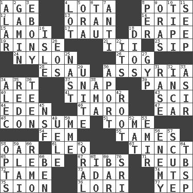ACROSS 1. Grow older 4. Globular water bottle used in Asia 8. Plant holders 12. Experiment locale 13. NW Algerian seaport 14. 4th largest of the Great Lakes 15. Mine, in Marseilles 17. Tense 18. Window treatment 19. Wash lightly 21. One more than two 23. Small drink 24. Thermoplastic polyamide 26. Coat; cloak 28. Son of Isaac 30. Nineveh was its capital 34. Tate display 37. Fastener 39. Baking dishes 40. Area sheltered from the wind 41. The easternmost of the Lesser Sundas 43. _-fi 44. Locale of original sin 46. Edible starchy tuberous root 47. Hearing organ 48. Eat 51. Heavy book 54. Opposite of masc. 55. Makes less strong or intense 58. Boat paddle 61. Lion 63. A color or tint 65. Cadet 67. Chest bones 71. Reuben's nickname 72. Docile 73. The sixth month of the Jewish calendar 74. Mountains (abbr.) 75. The Jewish people; Israel 76. Australian parrot (variant) 77. Slangy assent DOWN 1. Having or resembling wings 2. Homeless child 3. Black 4. Car dealer's back yard 5. Mouth or opening 6. The 19th letter of the Greek alphabet 7. Against 8. For each 9. Mouths or openings 10. Native american tent (variation) 11. Ooze 16. Capri or Wight 18. "Vaya con ____" 20. Greek goddess of the dawn 22. ___ a Wonderful Life 25. Political cartoonist Thomas 27. Swindle 29. Join together 30. To the left, to Queeg 31. To erase 32. South American Indian 33. SW Saudi Arabia district 34. Actor Baldwin 35. Redecorate 36. Adolescent 38. Housemaid (var.) 42. Carrot, for example 45. Overdraft (abbr.) 49. Ubangi River tributary 50. Madame (abbr.) 52. Floor covering 53. Arab leader 56. Foe 57. Snake scale 58. Elects 59. Jai _ 60. San ____ (Riviera town) 62. Relating to the mouth 64. Cook's measure (abbr.) 66. Benjamin's nick name 68. Wedding promise 69. Oblong piece of solid material 70. Indian title of respect (Mr.)