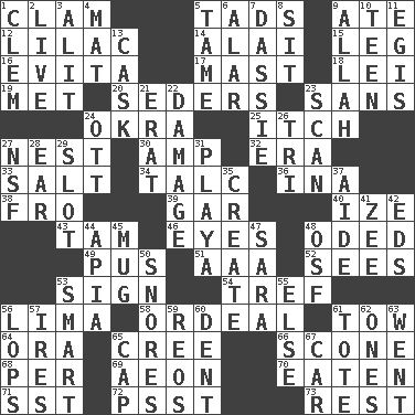ACROSS 1. Dollar (slang) 5. Small amounts or degrees 9. Had dinner 12. Pale purple color 14. Jai ____ 15. Part of a journey 16. Webber/Rice musical 17. Vertical spar for supporting sails 18. Flowery wreath 19. Was introduced to 20. Spring feasts 23. Without 24. Gumbo ingredient 25. Hankering 27. Egg locale 30. Electrical Unit 32. Epoch 33. Table seasoning 34. Baby powder 36. _ tizzy (2 wds.) 38. Back 39. Slender fish 40. Ending with capital 43. Scottish cap 46. Snake ____ (dice throw) 48. Wrote a lyric poem 49. Festering 51. American Automobile Association (abbr.) 52. Observes 53. Signal 54. Unclean, religiously 56. Pale green bean 58. Severe or trying experience 61. Pull behind 64. Mouth or opening 65. Algonquian 66. Biscuitlike quick bread 68. For each 69. Period of immesurable duration 70. Consumed 71. Fast jet (abbr.) 72. Inconspicuous attention getter 73. Remainder DOWN 1. Clement's nick name 2. Not recorded 3. Set down 4. Floor covering 5. Docile 6. Having or resembling wings 7. Hyrax 8. Be seated 9. Assad's deity 10. Adolescent 11. Armor plate that protects the chest 13. Keg 21. Part of Q.E.F. 22. Break 23. Examine hastily 24. Baseball player Mel 26. Three (prefix) 27. Science/research agcy. 28. Hearing organ 29. Notch 31. Beach, in Buenos Aires 35. Cause to be 37. Helper 41. Last letter of the English alphabet 42. Begley and Asner 44. Capital of Western Samoa 45. Java container 47. "Two Mules for Sister ____" 48. Order of Saint Francis (abbr.) 50. Sounds asleep 53. Don Adams' spy role 55. Otherwise 56. Chops off 57. Angers 59. Vintage cars 60. Gouge 61. Haul 62. Washington bills 63. Gone 65. Head covering 67. Auto