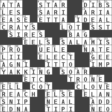 ACROSS 1. _ moment's notice (2 wds.) 4. Play the lead 8. Rights 12. French article 13. Indian skirt 14. Roberta Peters solo 15. Comfort 17. Singer James 18. Perfect 19. Trading vessels 21. Car dealer's back yard 23. Fast jet (abbr.) 24. Founders of families 26. Container for groceries 28. Snakelike fish 30. Deli grouping 34. Adept person 37. Ubangi River tributary 39. Nathan's nickname 40. Cards in a Roman deck? 41. Opt 43. Turn to the right 44. Hindu god of fire 46. "Tell ____ the Marines!" 47. Naughty child 48. Chattering 51. Fly high 54. And so on (abbr.) 55. Marketplace scale 58. Pipe bend 61. Small bed 63. Garlic unit 65. Arrive at 67. Otherwise 71. Style 72. Sever or remove by pinching or nipping 73. Be tempered by heat 74. Find the sum of 75. Pulitzer Prize-winning author Ferber 76. Native american tent (variation) 77. Modern: prefix DOWN 1. Actor Baldwin 2. Lacerates 3. Slender Brazilian palm 4. Compass dir. 5. Make lace 6. Nonscientific branch of learning 7. Monetary unit of Yemen 8. Male parent 9. Angers 10. Prejudice 11. Table seasoning 16. Jane of fiction 18. Slanted text style (abbr.) 20. Perceive with the eye 22. Chief or king in Benin or Nigeria 25. Change direction abruptly 27. Separate the seeds from cotton 29. Major League Baseball Commissioner Bud 30. Religious groups 31. Wise men 32. A distinct part 33. Ooze 34. Shaw product 35. Capital of Latvia 36. Pig sound 38. Allow 42. A blast of a horn 45. D.D.E's nickname 49. Hankering 50. Non-commissioned officer (abbr.) 52. Curve 53. Hero or heavy, e.g. 56. Pitcher Ryan 57. Elude 58. Celtic language 59. Grant temporary use of 60. (Had) reclined 62. Portable shelter 64. Inside; within (prefix) 66. Accounting whiz (abbr.) 68. Flowery wreath 69. Plant excrement 70. Connecticut Ivy Leaguer