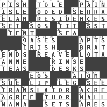 ACROSS 1. Expression of disdain 5. Lacquered or enameled metalware 9. Ache 13. Small island 14. Wrote a lyric poem 15. Father Junipero _ 16. Enthusiasm 17. Dwellings 19. Put into a specified state 20. Distress signal 21. Teat (slang) 22. Fast jet (abbr.) 23. Portable shelter 25. Ocean 26. Fertile tracts in a desert 30. Tenement units (abbr.) 34. From or relating to Ireland 35. Naughty child 36. Extremities 39. Break or tear apart 42. Globular water bottle used in Asia 43. Queen of England 1702-14 44. Wash lightly 46. Beverages made from leaves 47. Writing tables 48. Greek goddess of the dawn 51. Tiny particle 54. Take to court 57. Mouth edge 58. Part of a journey 60. Perceive with the eye 62. Interpreter 65. Measure of real estate 66. Match 67. Son of Odin 68. Shopping center 69. Grandmother 70. Arranges properly for use 71. Ancient Greek god of war DOWN 1. Sliced desserts 2. Small island 3. Chalkboard 4. Layer 5. "Corrida" creature 6. Lyric poems 7. French article 8. Prepares for publication 9. Writing instrument 10. Arches 11. Angers 12. Political cartoonist Thomas 15. Bristle 18. Expire 20. Play the lead 24. Annoying sounds 27. Title for a knight 28. Compass dir. 29. Pottery fragment 30. Most capable 31. Adept person 32. Make lace 33. R.R. building 36. Consume 37. Compass dir. 38. Heredity factor (abbr.) 40. Compete 41. Followers of ems 45. Heroin 48. Otherwise 49. Petroleum 50. Arguments over trivial matters 52. Witty Wilde 53. Haggard of country music 54. Comedian Laurel of Laurel & Hardy 55. Capital and largest city of Mongolia 56. Merit 58. Plunder 59. Blunders 61. Snakelike fish 63. Teachers' org. 64. Definite Article 65. Wet nurse (var.)
