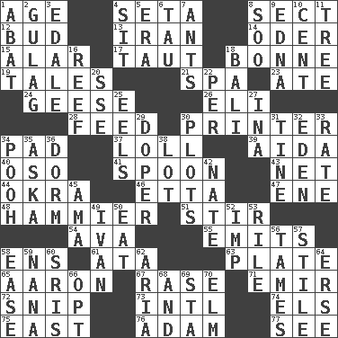 ACROSS 1. Ripen 4. Bristle 8. Religious group 12. Partially opened flower 13. SW Asia republic 14. River in Europe 15. Having or resembling wings 17. Drawn tight 18. Child's nurse 19. Lies 21. Health resort 23. Had dinner 24. Honkers 26. Connecticut Ivy Leaguer 28. Nourish 30. Hard copy producer 34. Writing tablet 37. Hang loosely or laxly 39. Opera by Verdi 40. Bear (Spanish) 41. Soup utensil 43. Fish or hair follower 44. Gumbo ingredient 46. Singer James 47. Compass dir. 48. More given to overacting 51. Tumult 54. Actress Gardner 55. Sends forth 58. Followers of ems 61. _ moment's notice (2 wds.) 63. Food holder 65. Composer Copland 67. To erase 71. Arab leader 72. Sever or remove by pinching or nipping 73. International (abbr.) 74. Raised railways 75. 90 degrees 76. First of billions? 77. Perceive with the eye DOWN 1. Blind as ____ 2. POW camp 3. Peak District village in England 4. Be seated 5. Epoch 6. The 19th letter of the Greek alphabet 7. Pismires 8. "Barney Miller" actor Jack 9. Pulitzer Prize-winning author Ferber 10. Penny 11. Woody plant 16. Coral collection 18. Indonesian resort city 20. Compass dir. 22. For each 25. Snakelike fish 27. _ tizzy (2 wds.) 29. Drug addict 30. Small pieces of grounds 31. Prong on a fork 32. Genesis locale 33. Assign a rank or rating to 34. "Silly old bear" 35. "____ silly question..." 36. Dormintory (informal) 38. Car dealer's back yard 42. Nathan's nickname 45. Nursemaid (var.) 49. _ the terrible 50. Erode 52. Naughty child 53. Cause heat under the collar 56. Makes less strong or intense 57. Vertical member of a panel or frame 58. Relaxation 59. Grandmother 60. Indian titles of respect 62. Roberta Peters solo 64. Celtic language 66. Elect 68. Added to 69. R.R. building 70. Shade tree