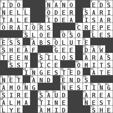 ACROSS 1. Wedding promise 4. Billionth: prefix 8. Begley and Asner 11. 1994 drama film starring Jodie Foster 13. Baltic tributary 14. Indian skirt 15. Falsehood 16. It may be bright or harebrained 17. Austrian river, tributary to the Danube 18. Speakers 21. Streamer paper 22. _ gin 23. Bear (Spanish) 25. French article 26. Curvy letter 29. Utter; complete 32. Archer's quiver 34. Unit of force equal to gravity 35. Simpleton 38. Adolescent 39. Grain storage towers 41. Ancient river in northeast Turkey 43. Fast jet (abbr.) 44. Frozen water 45. Leaves out 46. Eaten 50. Had dinner 51. Fish or hair follower 54. Added to 55. Conclusions 57. Amid 59. Nestling 63. Father 64. Saudi Arabian king (1953-1964) 67. Type of rug 68. _ mater 69. Prong on a fork 70. A home for chicks 71. Sodium hydroxide 72. Among 73. A female animal or person DOWN 1. To the inside or interior of 2. Letter starter 3. Rounded earthenware pot or jar 4. Annoying sounds 5. Find the sum of 6. Born 7. Mouth or opening 8. Artist's stand 9. Window treatment 10. Fathers 12. Allows 14. Title for a knight 19. Norwegian king 20. Director Reiner 21. Small bed 23. Margarine 24. Takes to court 26. Eastern Standard Time (abbr.) 27. "______ My Girl" (Turtles hit) 28. Perceives with the eye 30. Stares 31. Dutch treat 33. Against 36. Operatic vocal solo 37. Electrical Unit 39. Attach a signature 40. On the rocks 42. Compass dir. 45. Likelihood 47. Tired old horse 48. Watched over 49. Compass dir. 51. Relating to the nose 52. Poet Dickinson 53. Singer Mel 56. Comedian Laurel of Laurel & Hardy 58. Teachers' org. 60. Angers 61. Delicate 62. Yard entry 64. R.R. building 65. Direct toward a target or goal 66. Single; one (prefix)