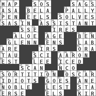 ACROSS 1. Atlas unit 4. Mayday 7. Droops 11. White ___ sheet 12. Actor Lugosi 13. Chummy 14. Fenced enclosure 15. Snakelike fish 16. Finds the solution 17. Indian antelope 19. Aide 21. Compass dir. 23. Angers 24. _ vera 25. Mature 26. Benjamin's nick name 29. American astronaut and politician John 30. Followers of ems 31. Experiment locale 32. "We ___ not amused" (Victoria) 33. Big collection agency 34. Mouth or opening 35. The 19th letter of the Greek alphabet 36. _-fi 37. Composer Copland 40. Eastern Standard Time (abbr.) 41. Area sheltered from the wind 42. On the rocks 43. Skim 45. Non-commissioned officer (abbr.) 46. Determination 51. Motion picture award 55. Foolish or stupid persons 56. Leaves 58. A saturated hydrocarbon 59. Having high moral qualities 60. For fear that 61. R.R. building 62. Celtic language 63. Raised railways 64. Apertif with cassis DOWN 1. Atlas contents 2. At sea 3. Baking dishes 4. Perceive with the eye 5. Spanish pot 6. Backtalk 7. Table seasonings 8. Inventor's middle name 9. Small, secluded valley 10. System (abbr.) 12. Gillaume's butler role 13. Airs 16. Fathers 18. Capri or Wight 20. Omens 22. Car or cant ending 24. Eskimo relative 25. Nest on high 26. Vital fluid 27. Merit 28. Basketball assoc. 29. Pate de foie ____ 32. Had dinner 33. Ancient Celtic tribe of eastern Britain 36. Narrow boards 37. The 18th letter of the Arabic alphabet 38. Buttonhole 39. Vintage cars 43. Fur scarf 44. Quote 46. Trig term 47. Aroma 48. Chest bones 49. Stare at amorously 50. Christmas carol 52. Keg 53. Against 54. Buttocks 57. Curvy letter