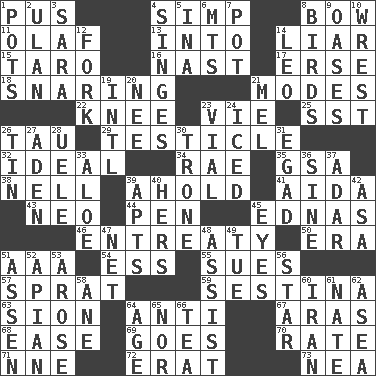 ACROSS 1. Ichor 4. Simple or foolish person 8. Arrow shooter 11. Norwegian king 13. To the inside or interior of 14. One who doesn't tell the truth 15. Pacific island yam 16. Political cartoonist Thomas 17. Celtic language 18. Catching in a trap 21. Methods 22. Leg joint 23. Compete 25. Fast jet (abbr.) 26. The 19th letter of the Greek alphabet 29. A testis 32. Standard of perfection 34. Actress Charlotte 35. Girls' org. (abbr.) 38. 1994 drama film starring Jodie Foster 39. Hold, grip (Informal) 41. Opera by Verdi 43. Modern: prefix 44. Animal enclosure 45. Ferber et al. 46. Plea 50. Period 51. American Automobile Association (abbr.) 54. Double-curved letter 55. Takes to court 57. Small fatty European fish 59. French poetic form 63. The Jewish people; Israel 64. Opposed to 67. Ancient river in northeast Turkey 68. Comfort 69. Moves 70. Assign a rank or rating to 71. Compass dir. 72. Part of Q.E.F. 73. Teachers' org. DOWN 1. Cooking vessels 2. ____ Bator 3. "Two Mules for Sister ____" 4. Scorches 5. _ tizzy (2 wds.) 6. Mountains (abbr.) 7. Cooking vessel 8. Avian creatures 9. Fertile tracts in a desert 10. Obtain by seizing forcibly or violently 12. Tined utensil 14. Lion 19. International (abbr.) 20. Born 21. Cartoonist voice _ Blanc 23. Small bottle 24. On the rocks 26. Shallow baking pan 27. Arabian gulf 28. Ubangi River tributary 30. Marketplace scale 31. Mild oath 33. _ vera 36. Trig term 37. The sixth month of the Jewish calendar 39. Tenement units (abbr.) 40. Possessive pronoun 42. White ___ sheet 45. Sight organs 47. Fish or hair follower 48. Help 49. Third day of the wk. 51. NE Netherlands city 52. Bee-related 53. Came up 56. Play the lead 58. One (Scot) 60. SW Asia republic 61. Nathan's nickname 62. At sea 64. Personal question 65. And not 66. Beverage made from leaves