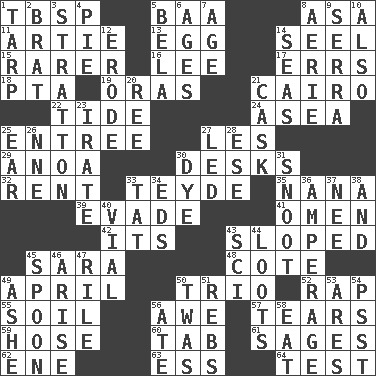 ACROSS 1. Cook's measure (abbr.) 5. Sound made by sheep 8. White ___ sheet 11. Nick name for Arthur 13. Oval reproductive body of a fowl 14. Stitch closed the eyes of (a falcon) 15. More valued for its uncommonness 16. Area sheltered from the wind 17. Blunders 18. Parent Teacher Assoc. 19. Mouths or openings 21. Capital of Egypt 22. Event that recurs at intervals 24. Toward the sea 25. Main course 27. French article 29. Small Philippine buffalo 30. Writing tables 32. Monthly bill 33. Miss Universe 1986, Barbara Palacios _ 35. Nanny 39. Elude 41. Sign of something about to happen 42. It is 43. Slanted 45. "Two Mules for Sister ____" 48. ____ d'Azur (French Riviera) 49. Showery time 50. Musical group of three 52. Strike 55. Land 56. Deep reverence 57. Separates forcefully 59. Flexible conduit 60. Keyboard key 61. Gurus 62. Compass dir. 63. Curvy letter 64. Trial DOWN 1. Canvas cover 2. Naughty child 3. Ski resort town in Vermont 4. Sliced dessert 5. Actor Lugosi 6. Matures 7. Grow older 8. Nest on high 9. Father Junipero _ 10. In addition 12. Wear away 14. Oceans 20. To sift 21. Keg 23. Feeling or showing extreme anger 25. Hearing organ 26. Compass dir. 27. Directed 28. Compass dir. 30. Color 31. Snout, nose 33. Make lace 34. Begley and Asner 36. Electrical Measurement 37. Born 38. Plus 40. Small bottle 43. _-fi 44. Plunders 45. Soup utensil 46. Get up 47. Cause heat under the collar 49. American tennis player Robert 50. It was, poetically 51. Confederate soldiers (slang) 53. Ancient Greek god of war 54. Inconspicuous attention getter 56. Had dinner 58. Erode