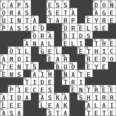 ACROSS 1. Smile enhancers 5. Curvy letter 8. Spanish title 11. Mouths or openings 12. Stalk of a moss capsule 14. Grow older 15. National forest in Provo, Utah 17. Canvas cover 18. Jane of fiction 19. Went by 21. Threatening words 23. Mouth or opening 25. Auction offers 26. Of or related to the anus 27. Connecticut Ivy Leaguer 28. Definite Article 31. Petroleum 33. Set 35. Principle of right and wrong 37. Mine, in Marseilles 38. Ewer handle 40. Make new 41. Portable shelters 43. Partially opened flower 45. Sight organ 46. Followers of ems 47. Direct toward a target or goal 50. Nathan's nickname 52. Periodic rise and fall of the sea level 53. Three (prefix) 54. Components 56. Main course 61. Opera by Verdi 62. "____ silly question..." 65. Bake eggs in their shells 66. Area sheltered from the wind 67. Path through which fluid escapes 68. Jai _ 69. White ___ sheet 70. R.R. building 71. Wig DOWN 1. Clever action or accomplishment 2. Roberta Peters solo 3. Zero-star reviews 4. Fast planes 5. Eastern Standard Time (abbr.) 6. Ocean 7. Disco prop 8. 24-hour periods 9. Legendary monster 10. Born 13. Showery time 16. Period of immesurable duration 18. Raised railways 20. To be drawn or hauled along 22. Singer Brickell 24. Toward shelter 26. Came down and settled, as after flight 28. Those people 29. Flintstone garb 30. Environmental prefix 31. Presage 32. Charged atoms 34. Experiment locale 36. Woody plant 37. Had dinner 39. The smallest animal of a litter 42. Ketch in the Levant 44. Have the gumption 48. Standard of perfection 49. Makes clutter 51. Metal containers 52. Beverage made from leaves 54. Sliced desserts 55. It may be bright or harebrained 57. Not this but _ 58. Cause heat under the collar 59. Part of Q.E.F. 60. 4th largest of the Great Lakes 61. Wing 63. Krazy ___ of comics 64. Alias (abbr.)