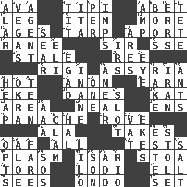 ACROSS 1. Actress Gardner 4. Native american tent (variation) 8. Collude with 12. Part of a journey 13. Detail 14. Greater amount 15. Matures 17. Canvas cover 18. To the left, to Queeg 19. Indian princess (variant) 21. Title for a knight 23. Compass dir. 24. Having lost freshness 26. To separate or throw off 28. Swiss mountan, "Queen of the Mountains" 30. Nineveh was its capital 34. Being at a high temperature 37. At once, immediately (arch.) 39. Merit 40. Supplement with great effort 41. Natives or inhabitants of Denmark 43. Krazy ___ of comics 44. Type of rug 46. Be tempered by heat 47. Followers of ems 48. Flamboyance 51. Be footloose 54. Chicken ___ king 55. Receives possession of 58. Clumsy lout 61. Everything 63. Trials 65. Suffix with ecto or cyto 67. Austrian river, tributary to the Danube 71. Portico 72. "Corrida" creature 73. Farming town in central California 74. Pipe bend 75. Perceives with the eye 76. Southwest Nigerian state 77. Arrange properly for use DOWN 1. Having or resembling wings 2. Viva Las _ 3. Rep 4. Teat (slang) 5. Call ___ day 6. For each 7. Naughty children 8. Electrical Unit 9. Scornful sounds 10. Blunders 11. Wig 16. Wither 18. Ancient Greek god of war 20. Biblical high priest 22. Big collection agency 25. Mild oath 27. Sight organ 29. Lacking in sense or substance 30. Approach 31. Libertine 32. SW Asia republic 33. Pismires 34. Pile 35. Gumbo ingredient 36. Adolescent 38. Single 42. Narrow, elongated depression 45. Auto club (abbr.) 49. Burrowing marine mollusk 50. Actor Linden 52. Large container 53. Supplements with great effort 56. _____ Park, CO 57. Took without asking 58. Elects 59. Medicinal plant 60. Conductor's collection 62. _ and Stitch 64. Table seasoning 66. Mayday 68. Manchild 69. Find the sum of 70. _ de Janeiro