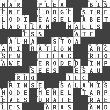 ACROSS 1. Armed conflict 4. Entreaty 8. Twice 11. Compass dir. 12. Inn 14. Beget 15. Farming town in central California 17. Artist's stand 18. Collude with 19. Of or relating to Laos or its people 21. Shopping centers 23. Double-curved letter 24. Had dinner 25. _ mater 27. Portico 30. Cuckoo 31. Food allowance for one day 34. Curve 37. Elected rep. 38. Pale purple color 39. River (Sp.) 40. Deep reverence 41. Worn away 43. Mischievous child 44. Perceives with the eye 45. He sold his birthright 47. Friend of Pooh 49. Affectionate concern, for short 50. Wash lightly 52. Deli grouping 56. Method 57. Klaipeda city 60. Canvas cover 61. Nights before holidays 62. A salt of uric acid 63. Actress Charlotte 64. French article 65. Ancient river in northeast Turkey 66. Added to DOWN 1. Water source 2. Small Philippine buffalo 3. Make new 4. Entreaties 5. Grant temporary use of 6. Begley and Asner 7. Grow older 8. God's Word 9. Angers 10. Arrange properly for use 13. Shade tree 14. Table seasoning 16. Detail 20. Austrian river, tributary to the Danube 22. American Automobile Association (abbr.) 25. Afresh 26. Actor's bit 27. Grain storage towers 28. Frog relative 29. Single time 30. White ___ sheet 32. Toward shelter 33. Hoop that covers a wheel 34. Operatic vocal solo 35. Tall New Zealand timber tree 36. Police officer (slang) 42. Small valley 44. Distress signal 46. Scram! 47. Amusement-park features 48. Washington bills 49. Lies 50. Be footloose 51. Australian flightless bird 52. Bristle 53. Hindu Mythology: god of death 54. SW Asia republic 55. Drove too fast 56. Cartoonist voice _ Blanc 58. Period 59. Spoil