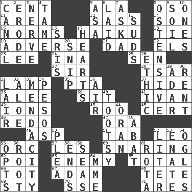 ACROSS 1. Penny 5. Insect wing 8. Bear (Spanish) 11. Type of rug 12. Backtalk 14. Manchild 15. Typical standards 17. Japanese verse 18. Neckwear 19. Contrary to your interests or welfare 21. June honoree 22. Raised railways 23. Area sheltered from the wind 24. _ tizzy (2 wds.) 25. Elected rep. 27. Title for a knight 28. Russian ruler of old 31. Desk light 35. Parent Teacher Association (abbr.) 37. Flintstone garb 38. Toward shelter 39. Be seated 41. "Terrible" tsar 42. Charged atoms 43. Friend of Pooh 45. An absolute certainty 46. Do over again 47. Mouth or opening 49. Viper 51. Bar bill 52. Lion 55. The grampus (Milton) 57. French article 60. Catching in a trap 62. Luau course 63. Foe 65. Add up to 66. Small child 67. First of billions? 68. False hair 69. Filthy place 70. Compass dir. 71. Ancient Greek god of war DOWN 1. Lessep's creation 2. Wear away 3. Impudent aggressiveness 4. Not wild 5. White ___ sheet 6. Put down 7. "____ silly question..." 8. Clearly or manifestly demonstrative 9. Land 10. Singles 13. Beer foam 16. Indian titles of respect 17. Centers 20. Sever or remove by pinching or nipping 26. Moral principle 29. The sixth month of the Jewish calendar 30. Monthly bill 31. Den 32. Medicinal plant 33. Ananias' fault 34. Mexican monetary units 36. Wind 40. A girl or young woman (variant) 44. Northwest Algerian city 48. Blind as ____ 50. Entreaty 52. 61 cubic inches 53. Related on the mother's side 54. Stares at amorously 55. Chooses 56. Carrot, for example 58. Conclusions 59. Oceans 61. Roll call or roster of names 64. Madame (abbr.)