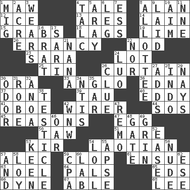ACROSS 1. Opening into something insatiable 4. Story 8. ____ Jay Lerner 12. Frozen water 13. Ancient Greek god of war 14. (Had) reclined 15. Seizes 18. Fails to keep up a pace 19. Welles in "The Third Man" 20. The state or an instance of erring 22. Lower and raise head in agreement 23. "Two Mules for Sister ____" 24. Car dealer's back yard 25. Metal container 26. Window treatment 30. Mouth or opening 33. White American of non-Hispanic descent 36. Pulitzer Prize-winning author Ferber 37. Do not 39. The 19th letter of the Greek alphabet 40. Whirlpool 41. Mitch Miller's instrument 42. One who wires 44. Mayday 45. Thinks logically 47. Ovum 50. The 23rd letter of the Hebrew alphabet 51. Female horse 53. Apertif with cassis 54. Of or relating to Laos or its people 57. Actor Baldwin 59. Hoof sound 61. Take place subsequently 63. Christmas carol 64. Friends 65. Begley and Asner 66. Centimeter-gram-second unit of force 67. Competent 68. Area sheltered from the wind DOWN 1. Russian fighter aircraft 2. Measure of real estate 3. Erodes 4. Baby powder 5. Like ___ of sunshine 6. Part of a journey 7. Curvy letter 8. One to whom something is allotted 9. Put down 10. Direct toward a target or goal 11. Compass dir. 16. Naughty child 17. Indian skirt 21. Nanny 22. And not 24. Nilotic language 26. A slight indication 27. Does sums 28. _ china 29. Negative votes 30. Scent 31. Loose flowing garment 32. Small Philippine buffalo 34. Nuclear Threat Initiatives 35. Slender fish 38. A testis 42. Compass dir. 43. San ____ (Riviera town) 46. Boat paddle 48. Yard entry 49. Amused look 52. Artist's stand 53. Peachy ____! 54. Hang loosely or laxly 55. Domed church section 56. Naked 57. Also 58. Myrna of the movies 59. Tax preparer (abbr.) 60. Experiment locale 62. Compass dir.