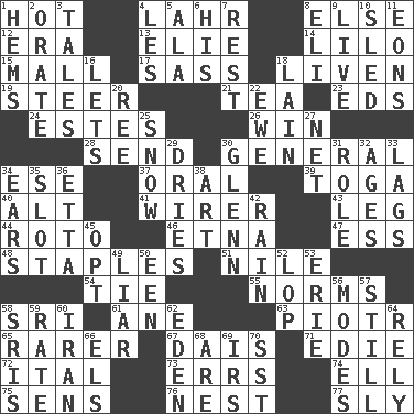 ACROSS 1. Being at a high temperature 4. Cowardly lion portrayer 8. Otherwise 12. Period 13. Writer Wiesel 14. _ and Stitch 15. Shopping center 17. Backtalk 18. Make or become more lively 19. Navigate 21. Afternoon social gathering 23. Begley and Asner 24. _____ Park, CO 26. Victory 28. Transmit 30. Commissioned military rank 34. Compass dir. 37. Of the mouth 39. Ancient Roman robe 40. Keyboard modifier key 41. One who wires 43. Part of a journey 44. Printing process, for short 46. Inactive volcano in Sicily 47. Curvy letter 48. Paper fasteners 51. "Death on the ____" 54. Neckwear 55. Typical standards 58. _ Lanka 61. A saturated hydrocarbon 63. Peter (Polish) 65. More valued for its uncommonness 67. Raised platform 71. Singer Brickell 72. Slanted text style (abbr.) 73. Blunders 74. Pipe bend 75. Elected reps. 76. A home for chicks 77. Insidious DOWN 1. Cloth borders 2. Speak pompously 3. Falsehoods 4. French article 5. In the manner of 6. Part of HMS, perhaps 7. Relief 8. Connecticut Ivy Leaguer 9. Not recorded 10. Downhill vehicle 11. Immeasurably long periods of time 16. Allows 18. (Had) reclined 20. Portuguese money of account (variant) 22. She-sheep 25. Overwhelm 27. Fish or hair follower 29. Frees from moisture 30. American astronaut and politician John 31. Hero or heavy, e.g. 32. Ripens 33. Falls behind 34. Hearing organs 35. Notch 36. Singer James 38. Tate display 42. Water falling in drops from the sky 45. Elect 49. One who doesn't tell the truth 50. Car or cant ending 52. Chop off 53. 4th largest of the Great Lakes 56. Methods 57. Free from disturbance or agitation 58. Indian titles of respect 59. Assign a rank or rating to 60. SW Asia republic 62. Genesis locale 64. Trust 66. Raised railways 68. "We ___ not amused" (Victoria) 69. Big collection agency 70. Fast jet (abbr.)