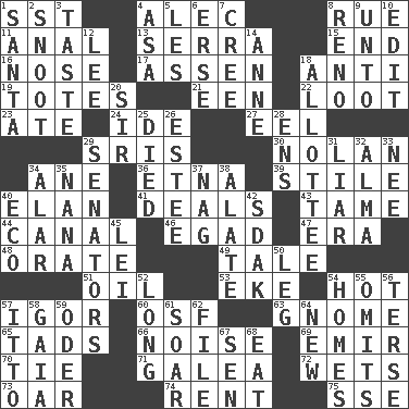 ACROSS 1. Fast jet (abbr.) 4. Actor Baldwin 8. Sorrow 11. Of or related to the anus 13. Spanish missionary in California 15. Conclusion 16. Sense of smell 17. NE Netherlands city 18. Opposed to 19. Lugs 21. Car or cant ending 22. Spoils 23. Had dinner 24. Binary compound 27. Snakelike fish 29. Indian titles of respect 30. Pitcher Ryan 34. One (Scot) 36. Inactive volcano in Sicily 39. Vertical member of a panel or frame 40. Enthusiasm 41. Allots cards 43. Not wild 44. Lessep's creation 46. Mild oath 47. Epoch 48. Speak pompously 49. Lie 51. Petroleum 53. Make supply last 54. Being at a high temperature 57. Russian composer Stravinsky 60. Order of Saint Francis (abbr.) 63. Dwarf 65. Bits 66. Annoying sound 69. Arab leader 70. Make a knot 71. An organ shaped like a helmet 72. Moistens 73. Boat paddle 74. Monthly bill 75. Compass dir. DOWN 1. Before Barbara or Clara 2. Snob 3. Clothes sense 4. White ___ sheet 5. French article 6. Celtic language 7. Algonquian 8. Former U.S. Attorney General Janet 9. To (old English) 10. Prepare for publication 12. Area sheltered from the wind 14. Queen of England 1702-14 18. One to whom something is allotted 20. Title for a knight 25. Passed on 26. First name in cosmetics 28. Followers of ems 29. Legislators 31. One who doesn't tell the truth 32. _ mater 33. Born 34. Having or resembling wings 35. Grandmother 37. Tired old horse 38. Having winglike extensions 40. Environmental prefix 42. Neighbor of Neb. 45. Luau accessory 50. Part of a journey 52. Yearn 54. Residences 55. Leaves out 56. Laconic 57. "Tell ____ the Marines!" 58. Greek goddess of the earth (variant) 59. Baltic tributary 61. Fly high 62. Do some clerical work 64. ___ Haven, CT 67. Elected rep. 68. Consume
