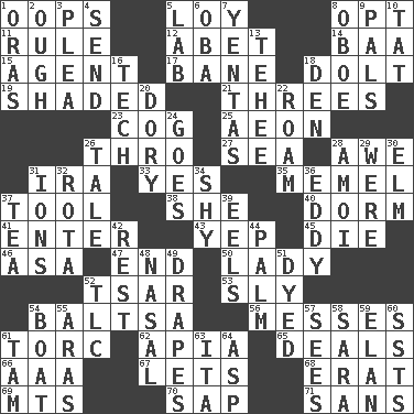ACROSS 1. I made a mistake 5. Myrna of the movies 8. Elect 11. Governing power 12. Collude with 14. Sound made by sheep 15. Representative 17. Object of repulsion 18. Dunce 19. Cast a shadow over 21. Trios 23. Gear tooth 25. Age 26. Through, poetically 27. Ocean 28. Deep reverence 31. Lyricist Gershwin 33. Consenting reply 35. Klaipeda city 37. Implement 38. A female animal or person 40. Dormintory (informal) 41. Keyboard key 43. Slangy assent 45. Expire 46. White ___ sheet 47. Conclude 50. Kenny Rogers chart-topper in '80 52. Russian ruler of old 53. Mischievous 54. Greek mezzo-soprano Agnes 56. Makes clutter 61. Torque (variant) 62. Capital of Western Samoa 65. Allots cards 66. Auto club (abbr.) 67. Allows 68. Part of Q.E.F. 69. Mountains (abbr.) 70. Plant excrement 71. Without DOWN 1. Mouths or openings 2. Ending for "Through" and "Enough" 3. Entreaty 4. Post 5. Experiment locale 6. Chief or king in Benin or Nigeria 7. Gossips 8. Mitch Miller's instrument 9. Friends 10. Make lace 13. Giggle 16. Technical 18. Lair 20. Rowboat 22. Wander 24. Leaves 26. Story 28. Mine, in Marseilles 29. Past tense of be (plural) 30. Shade tree 31. Charged atoms 32. Round or rotation of duties 34. Like a shrinking violet 36. Whirlpool 37. Afternoon social gathering 39. Snakelike fish 42. Remainder 44. Inside of hand 48. Relating to the nose 49. Window treatments 51. Colored 52. Affectionate concern, for short 54. Water vessel 55. Ancient river in northeast Turkey 57. Observes 58. "Two Mules for Sister ____" 59. Enthusiasm 60. Fast planes 61. Scottish cap 63. Call ___ day 64. Cleo's killer