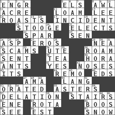 ACROSS 1. Engineer (abbr.) 5. Raised railways 8. Leather borer 11. 1/640 square mile 12. Rich soil 13. Area sheltered from the wind 14. Exposes to great heat 17. Happening 19. Moe Howard, for one 21. Chooses 22. Practice fight 23. Elected rep. 24. Cleo's killer 27. Greek god of love 29. Teachers' org. 32. Fraudulent business schemes 34. Shoshoni 36. Wander aimlessly 37. Posted 38. Afternoon social gathering 39. Israeli folk dance 40. Pismires 41. Consenting reply 42. Olfactory organs 43. ___ a Wonderful Life 44. San ____ (Riviera town) 46. Begley and Asner 47. Wet nurse (var.) 50. Long (Scottish) 52. Spoke pompously 55. Michaelmas daisies 57. Accusation by an informer 59. Flight of steps 62. Compass dir. 63. Round or rotation of duties 64. Scornful sounds 65. Perceive with the eye 66. Eastern Standard Time (abbr.) 67. Frozen precipitation DOWN 1. Ewer handle 2. Non-commissioned officer (abbr.) 3. Pate de foie ____ 4. Musical pauses 5. A really long time 6. Shoestrings 7. Grin 8. Actor Baldwin 9. Gone 10. Allows 12. Falsehood 15. Drinks excessively 16. Fly high 18. Lair 20. Sulky 24. Slender Brazilian palm 25. Aroma 26. Leg coverings 28. Guide 29. Trap for birds or small mammals 30. Having ears or earlike features 31. Collect or gather 33. Mountains (abbr.) 35. Artist's stands 36. 17th letter of the Greek alphabet 42. Music written for nine 45. Floor protectors 47. "One Day ___ Time" 48. Distance measurement (Brit.) 49. Goodbye (Sp.) 51. Catches 52. Lyric poems 53. French philosopher Descartes 54. Toward shelter 55. Santa ___, CA 56. The Jewish people; Israel 58. Baseball player Mel 60. Friend of Pooh 61. Compass dir.