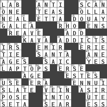 ACROSS 1. Experiment locale 4. Against 8. Glance over 12. Single 13. Afternoon social gatherings 14. Spanish pot 15. Be tempered by heat 17. Singer James 18. A city in N France, SE of Calais 19. An organ shaped like a helmet 21. 17th letter of the Greek alphabet 23. Followers of ems 24. Break or tear apart 26. Find the sum of 28. Polynesian shrub of the pepper family 30. Inveterate users 34. Big collection agency 37. Independent ruler or chieftain 39. One of the Great Lakes 40. Neckwear 41. Before Barbara or Clara 43. One (Scot) 44. Matures 46. Ketch in the Levant 47. Consenting reply 48. Portable computers 51. Celtic language 54. Grow older 55. _____ Park, CO 58. Purpose 61. Period 63. World-weariness 65. Chalkboard 67. Distinctive style or manner 71. SW Saudi Arabia district 72. Introduce or present, as a question 73. To the inside or interior of 74. Shoshoni 75. Stalk of a moss capsule 76. Shrivel 77. Curvy letter DOWN 1. Protracted 2. Approach 3. Memphis, Tenn. Street 4. Had dinner 5. Fish or hair follower 6. Make lace 7. Austrian river, tributary to the Danube 8. "Barney Miller" actor Jack 9. A slight indication 10. ____ Jay Lerner 11. Negative votes 16. Path through which fluid escapes 18. Texas town _ City 20. Actress Gardner 22. Possessed 25. Nights before holidays 27. Expire 29. Collect or gather 30. Nick name for Arthur 31. Supercomputer manufacturer 32. Prong on a fork 33. Perceives with the eye 34. Slanted text style (abbr.) 35. Port city in Latvia 36. Ooze 38. _ tizzy (2 wds.) 42. 1/640 square mile 45. R.R. building 49. Double curve, resembling the letter S 50. For each 52. Compass dir. 53. Inactive volcano in Sicily 56. Take place subsequently 57. Sets of matching outer garments 58. United States Postal Service (abbr.) 59. A type of plum 60. 90 degrees 62. Advice 64. Angers 66. Afternoon social gathering 68. Compass dir. 69. Call ___ day 70. Or not