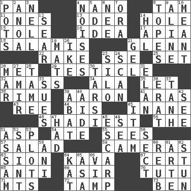 ACROSS 1. Baking dish 4. Billionth: prefix 8. Scottish cap 11. Singles 13. River in Europe 14. Hollow 15. Lacquered or enameled metalware 16. The main thing one is thinking about 17. Capital of Western Samoa 18. Deli grouping 21. American astronaut and politician John 22. Libertine 23. Compass dir. 25. Put into a specified state 26. Was introduced to 29. A testis 32. Collect or gather 34. Chicken ___ king 35. Allow 38. Tall New Zealand timber tree 39. Composer Copland 41. Caspian sea tributary 43. To sift 44. Again 45. Silly 46. Most questionable 50. Definite Article 51. Viper 54. Had dinner 55. Observes 57. First course 59. Devices for capturing images 63. The Jewish people; Israel 64. Polynesian shrub of the pepper family 67. Foregone conclusion 68. Opposed to 69. SW Saudi Arabia district 70. Ballerina skirt 71. Mountains (abbr.) 72. Pack (down) 73. Benjamin's nick name DOWN 1. Plant holders 2. Small Philippine buffalo 3. 1994 drama film starring Jodie Foster 4. Annoying sounds 5. Increase 6. Born 7. Mouth or opening 8. Drinks excessively 9. Place in a line 10. Intended 12. Burn superficially 14. Actor Linden 19. Floor coverings 20. D.D.E's nickname 21. Set 23. Grain storage tower 24. Examine minutely or intensely 26. Impair 27. Arab leader 28. Docile 30. Tarsus (plural) 31. Enthusiasm 33. Institutes legal proceedings 36. Part of Q.E.F. 37. Hyperbolic tangent 39. Blind as ____ 40. Helper 42. Perceive with the eye 45. Detail 47. Possessed 48. Fortification 49. Ocean 51. Indian state 52. Virtuous person 53. Small pieces of grounds 56. Religious group 58. Cuckoo 60. Reuben's nickname 61. Johnson of "Laugh-In" 62. Astound 64. Krazy ___ of comics 65. White ___ sheet 66. Zeal