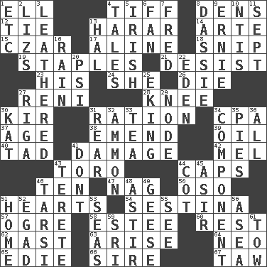 ACROSS 1. Pipe bend 4. Small quarrel 8. Habitations of wild animals 12. Neckwear 13. Ethiopian city, capital of Harari 14. Johnson of "Laugh-In" 15. Russian ruler of old 17. Place in a line 18. Clip 19. Paper fasteners 21. Cease 23. Part of HMS, perhaps 24. A female animal or person 26. Pass on 27. Painter Guido (1575-1642) 28. Leg joint 30. Apertif with cassis 31. Food allowance for one day 34. Tax preparer (abbr.) 37. Mature 38. Make improvements or corrections to 39. Lubricate 40. Small amount or degree 41. Break 42. Cartoonist voice _ Blanc 43. "Corrida" creature 44. Smile enhancers 46. "___ Little Indians" 47. Tired old horse 50. Bear (Spanish) 51. Centers 54. French poetic form 57. Legendary monster 58. First name in cosmetics 60. Relief 62. Vertical spar for supporting sails 63. Originate 64. Modern: prefix 65. Singer Brickell 66. The founder of a family 67. The 23rd letter of the Hebrew alphabet DOWN 1. And so on (abbr.) 2. Belonging to Elizabeth 3. Tough but pliablecoriaceous 4. Falsehoods 5. From or relating to Ireland 6. Avid follower 7. Flintstone 8. Hyrax 9. Bert's buddy 10. Nuclear Threat Initiatives 11. Back-to-school mo. 13. Actor Linden 16. Water falling in drops from the sky 20. Air pressure measure (abbr.) 22. Locale of original sin 25. Supplementing with great effort 27. Port city in Latvia 29. Connecting point 30. Krazy ___ of comics 31. Buttocks 32. ID or VA city 33. Afternoon social gathering 34. Piece 35. Sliced desserts 36. Everything 41. Do not 43. Cigar-shaped 44. Small bed 45. SW Saudi Arabia district 46. Tarsus (plural) 48. Moving or stirring 49. Honkers 51. Dwelling 52. Mild oath 53. Oceans 55. Observe 56. At sea 59. Indian title of respect (Mr.) 61. Pull behind