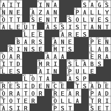 ACROSS 1. Small island 4. _ tizzy (2 wds.) 7. Sinks 11. Compass dir. 12. Muslim summons to prayer 13. Friendly 14. Baseball player Mel 15. Transmitted 16. Finds the solution 17. Eskimo relative 19. Helper 21. Area sheltered from the wind 23. Ancient Greek god of war 24. Soap units 25. A saturated hydrocarbon 26. Writing instrument 29. Wash lightly 30. Mountains (abbr.) 31. Experiment locale 32. Rowing implement 33. Auto club (abbr.) 34. Epoch 35. It would 36. Medical imaging device (abbr.) 37. Broad, flat, thick pieces 40. French article 41. The 18th letter of the Arabic alphabet 42. Whine 43. Globular water bottle used in Asia 45. Cleo's killer 46. Home 51. Sadhe (variant) 55. Speaker 56. Hitchcock's "____ Window" 58. Writing tablet 59. Carrier 60. Spanish pot 61. Three (prefix) 62. SW Saudi Arabia district 63. Pacific Standard Time (abbr.) 64. Put into a specified state DOWN 1. Small Philippine buffalo 2. International (abbr.) 3. False hair 4. Ending with capital 5. Grandmother 6. Pismires 7. Table seasonings 8. Inventor's middle name 9. Small, secluded valley 10. System (abbr.) 12. Michaelmas daisies 13. Airs 16. Titles for men of rank and authority 18. Uhlan (variant) 20. Before Barbara or Clara 22. Compass dir. 24. Avian creatures 25. At full speed 26. Military trainee 27. Hearing organs 28. Basketball assoc. 29. Pace 32. Petroleum 33. Believer in; advocate of (suffix) 36. Mother 37. Health resort 38. A period of five years 39. High mountains 43. 61 cubic inches 44. Scent 46. Round or rotation of duties 47. Greek god of love 48. Suttee (variant) 49. Riding implement 50. Snakelike fish 52. Flats, for short 53. Have the gumption 54. Prepare for publication 57. Keyboard modifier key