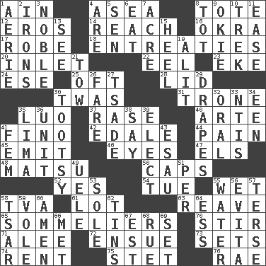ACROSS 1. The 18th letter of the Arabic alphabet 4. At sea 8. Carry 12. Greek god of love 14. Arrive at 16. Gumbo ingredient 17. Loose flowing garment 18. Pleas 20. An arm off of a larger body of water 22. Snakelike fish 23. Make supply last 24. Compass dir. 25. Often (poetically) 28. Flaplike covering 30. It was, poetically 31. Marketplace scale 35. Nilotic language 37. To erase 40. Johnson of "Laugh-In" 41. Fine (Spanish) 42. Peak District village in England 44. Ache 45. Send forth 46. Sight organs 47. Raised railways 48. Taiwanese island in East China Sea 50. Balmoral and tarboosh 52. It is so 54. Third day of the wk. 55. Soggy 58. Federal power corp. 61. Car dealer's back yard 63. Break or tear apart 65. Wine waiters 70. Commotion 71. Toward shelter 72. Take place subsequently 73. Arranges properly for use 74. Monthly bill 75. Proofreading order 76. Actress Charlotte DOWN 1. Nest on high 2. Removes the wrinkles 3. Impressive in appearance 4. "We ___ not amused" (Victoria) 5. Elected rep. 6. Consume 7. 1/640 square mile 8. Small child 9. Migrant worker of the '30s 10. Long journey 11. Relaxation 13. Observe 15. Person who is morally reprehensible 19. Came down and settled, as after flight 21. Pull behind 26. Conductor's collection 27. Sadhe (variant) 29. Window treatments 30. A girl or young woman (variant) 32. Spoken 33. Nuclear Threat Initiatives 34. Car or cant ending 35. Pale green bean 36. A single undivided whole 38. Declare 39. Opt 41. Opposite of masc. 43. He sold his birthright 49. Ubangi River tributary 51. For each 53. Not divided or shared with others 55. Wetness 56. Webber/Rice musical 57. Laconic 58. Russian ruler of old 59. Short-tailed, large-bodied rat 60. So be it 62. Metal containers 64. Curvy letter 66. Was introduced to 67. Eastern Standard Time (abbr.) 68. Sorrow 69. Arrange properly for use