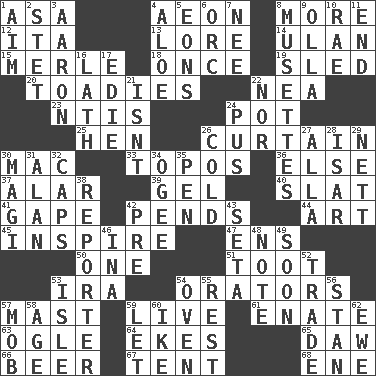 ACROSS 1. White ___ sheet 4. A really long time 8. Greater amount 12. Call ___ day 13. Old wives' tales, e.g. 14. Uhlan (variant) 15. Haggard of country music 18. At one time in the past 19. Downhill vehicle 20. Sycophants 22. Teachers' org. 23. Nuclear Threat Initiatives 24. Cooking vessel 25. Layer 26. Window treatment 30. Apple computer (short form) 33. Literary convention 36. Otherwise 37. Having or resembling wings 39. Set 40. Narrow board 41. Yawn 42. Hangs 44. Nonscientific branch of learning 45. Stimulate to action 47. Followers of ems 50. Single 51. A blast of a horn 53. Lyricist Gershwin 54. Speakers 57. Vertical spar for supporting sails 59. Not recorded 61. Maternal 63. Stare 64. Supplements with great effort 65. Fool 66. Fermented drink made from hops 67. Portable shelter 68. Compass dir. DOWN 1. Direct toward a target or goal 2. Proofreading order 3. Composer Copland 4. _ vera 5. Immeasurably long periods of time 6. The grampus (Milton) 7. Born 8. French bagpipes 9. Water jar 10. Actress Charlotte 11. Conclude 16. Thin strip of wood or metal 17. Singer Brickell 21. Is not 22. And not 24. Ichor 26. Chilled 27. Silent film actress Nazimova 28. Austrian river, tributary to the Danube 29. Remaining after all deductions 30. Wise men 31. ____ Jay Lerner 32. Smile enhancers 34. Double curve, resembling the letter S 35. Animal enclosure 38. Newsperson 42. Before (prefix) 43. Bristle 46. _ tizzy (2 wds.) 48. Brief written record 49. Within a short period 52. Exchange 53. Small island 54. Baking chamber 55. Respite 56. Comedian Laurel of Laurel & Hardy 57. Disorderly crowd 58. Ripen 59. Allow 60. D.D.E's nickname 62. She-sheep