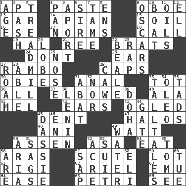 ACROSS 1. Fitting 4. Thick mixture 9. Mitch Miller's instrument 13. Slender fish 14. Bee-related 15. Earth 16. Compass dir. 17. Typical standards 18. Give a ring to 19. Actor Linden 21. To sift 22. Naughty children 24. Do not 26. Hearing organ 27. Role for Stallone 29. Smile enhancers 30. Off-Broadway awards 31. Of or related to the anus 33. Small child 36. Everything 37. Turned at an angle; bent 40. Wing 41. Cartoonist voice _ Blanc 42. Hearing organs 43. Stared 45. Gouge 47. Saint headwear 48. Cuckoo 49. Electrical Unit 50. NE Netherlands city 52. White ___ sheet 54. Consume 56. Caspian sea tributary 57. Scutum 59. Car dealer's back yard 61. Swiss mountan, "Queen of the Mountains" 62. Satellite of Uranus 63. Australian flightless bird 64. Comfort 65. _ dish (used to culture cells) 66. Perceive with the eye DOWN 1. Personal question 2. Romantic infatuation 3. Excercise machine 4. Baking dish 5. To the left, to Queeg 6. Beget 7. Docile 8. Followers of ems 9. Motion picture awards 10. Water vessel 11. Petroleums 12. Pipe bend 20. Ear part 22. Calif. Air Force Base 23. Reproach for some lapse or misdeed 25. Olfactory organ 27. Wander aimlessly 28. Competent 29. Crow sounds 31. Blind as ____ 32. Or not 33. Baron Munchausen's specialties 34. Margarine 35. Small amounts or degrees 38. Soviet premier 1918-24 39. Capital of the state of Qatar 44. Yard entry 45. Hyrax 46. Compass dir. 49. Wetness 50. Operatic vocal solo 51. Sinks 52. Land measure 53. Costume for a special activity 55. Heavy book 56. "We ___ not amused" (Victoria) 57. Plant excrement 58. Biblical high priest 60. Third day of the wk.