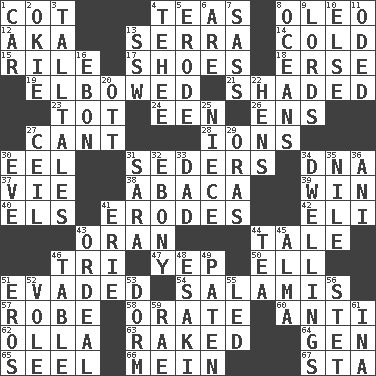 ACROSS 1. Small bed 4. Afternoon social gatherings 8. Butter sub 12. Alias (abbr.) 13. Father Junipero _ 14. Having a low temperature 15. Cause heat under the collar 17. Imelda's hoard 18. Celtic language 19. Turned at an angle; bent 21. Cast a shadow over 23. Small child 24. Car or cant ending 26. Followers of ems 27. Patter 28. Charged particles 30. Snakelike fish 31. Spring feasts 34. Heredity factor (abbr.) 37. Compete 38. Phillipine bananalike plant 39. Victory 40. Raised railways 41. Eats (away) 42. Biblical high priest 43. Northwest Algerian city 44. Story 46. Three (prefix) 47. Slangy assent 50. Pipe bend 51. Dodged 54. Deli grouping 57. Loose flowing garment 58. Speak pompously 60. Opposed to 62. Water jar 63. Moved through 64. Commissioned mil. rank 65. Sew up the eyelids of hawks and falcons 66. Chow _ 67. R.R. building DOWN 1. 4-wheeled motor vehicle 2. Migrant worker of the '30s 3. Baron Munchausen's specialties 4. Giggle 5. Eat (away) 6. "We ___ not amused" (Victoria) 7. Backtalk 8. Seas 9. Nobles 10. Otherwise 11. Wrote a lyric poem 13. Compass dir. 16. Inky black, to poets 20. Baseball player Mel 22. Coop moms 25. Sibling's daughter 27. To provide with a ceiling 29. Mouths or openings 30. Night before a holiday 31. "Two Mules for Sister ____" 32. Dark wood 33. June honoree 34. Homes 35. The longest river in the world 36. Cuckoo 41. One of the Great Lakes 43. Severe or trying experience 44. Afternoon social gathering 45. _ mater 46. Eating place 48. 1973 Nobel Price Winner (Physics) Leo 49. Eucharist need 51. Greek god of love 52. Short-tailed, large-bodied rat 53. Dormintory (informal) 55. Directed 56. Proofreading order 59. Actress Charlotte 61. _ tizzy (2 wds.)