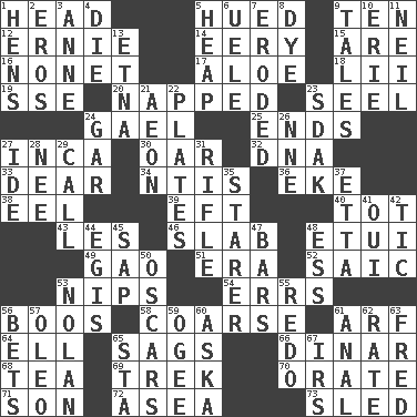 ACROSS 1. Froth on beer 5. Became colored 9. Nine, plus one 12. Bert's buddy 14. Suggestive of the supernatural 15. "We ___ not amused" (Victoria) 16. Music written for nine 17. _ vera 18. Cards in a Roman deck? 19. Compass dir. 20. Slept 23. Stitch closed the eyes of (a falcon) 24. Highlander 25. Conclusions 27. South American Indian 30. Boat paddle 32. Heredity factor (abbr.) 33. Letter starter 34. Nuclear Threat Initiatives 36. Make supply last 38. Snakelike fish 39. Newt 40. Small child 43. French article 46. Thick slice 48. Needle holder 49. E Mali city 51. Epoch 52. Ketch in the Levant 53. Cuts off 54. Blunders 56. Expressions of contempt or scorn 58. Rough 61. Sandy's bark 64. Pipe bend 65. Droops 66. Middle Eastern gold or silver currency 68. Afternoon social gathering 69. Long journey 70. Declaim 71. Boy, to dad 72. Toward the sea 73. Downhill vehicle DOWN 1. Coop moms 2. Greek god of love 3. Queen of England 1702-14 4. Pass on 5. Pile 6. Ubangi River tributary 7. Eaten away 8. Color 9. Lies 10. One of the Great Lakes 11. Famous astronaut Armstrong 13. Inactive volcano in Sicily 21. A really long time 22. Food holders 23. Neighbor of Neb. 24. Slender fish 26. Compass dir. 27. Binary compound 28. Born 29. Give a ring to 31. Firearm 35. A viewer who gazes fixedly 37. Singer James 41. Fr. "Yes" 42. Nervous spasm 44. Armor plate that protects the chest 45. Plant excrement 47. Long, evenly shaped pieces 48. Double-curved letter 50. Motion picture awards 53. Pitcher Ryan 55. Do over again 56. Wagers 57. Butter sub 59. Double curve, resembling the letter S 60. "____ silly question..." 61. Of or related to the anus 62. Pace 63. Flintstone 65. R.R. building 67. Big collection agency