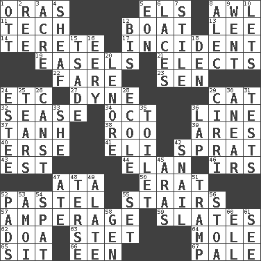 ACROSS 1. Mouths or openings 5. Raised railways 8. Leather borer 11. Technical 12. Water vessel 13. Area sheltered from the wind 14. Cylindrical with tapered ends 17. Happening 19. Artist's stands 21. Opts 22. Conductor's collection 23. Elected rep. 24. And so on (abbr.) 27. Centimeter-gram-second unit of force 29. Domesticated feline 32. Gospel singer Marvin 34. Sep. follower 36. Actor's bit 37. Hyperbolic tangent 38. Friend of Pooh 39. Ancient Greek god of war 40. Celtic language 41. Connecticut Ivy Leaguer 42. Small fatty European fish 43. Eastern Standard Time (abbr.) 44. Liveliness 46. Big collection agency 47. "One Day ___ Time" 50. Part of Q.E.F. 52. Soft color 55. Flight of steps 57. Electrical Measurement 59. Chalkboards 62. ___ good deed 63. Proofreading order 64. Undercover agent 65. Be seated 66. Car or cant ending 67. Diluted with white DOWN 1. Baseball player Mel 2. To riddle 3. Land measure 4. To gather and bind into a bundle 5. Period of immesurable duration 6. Shoestrings 7. Vertical member of a panel or frame 8. Actor Baldwin 9. Gone 10. Allows 12. Twice 15. Sadhe (variant) 16. Suggestive of the supernatural 18. Lair 20. Poe poem 24. First name in cosmetics 25. Separates forcefully 26. 2nd pers. sing. pres. of can (arch.) 28. Learning spot: Fr. 29. High-altitude cloud 30. Approach 31. Trials 33. A female animal or person 35. Bathroom 36. Infant locale 42. Slow-paced one 45. Ancient river in northeast Turkey 47. Had dinner 48. Laconic 49. Having winglike extensions 51. _____ steamer (cargo ship) 52. Writing tablets 53. Mine, in Marseilles 54. Petty quarrel 55. Arrange properly for use 56. Portico 58. Commissioned mil. rank 60. Pipe bend 61. Observe