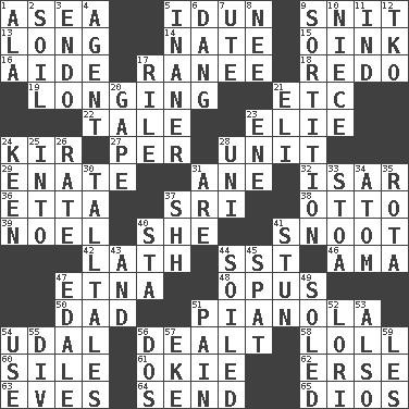 ACROSS 1. Toward the sea 5. Goddess of spring and wife of Bragi 9. In a ____ (agitated or irritated) 13. Protracted 14. Nathan's nickname 15. Pig sound 16. Assistant 17. Indian princess (variant) 18. Make new 19. Yearning 21. And so on (abbr.) 22. Lie 23. Writer Wiesel 24. Apertif with cassis 27. For each 28. A single undivided whole 29. Related on the mother's side 31. A saturated hydrocarbon 32. Austrian river, tributary to the Danube 36. Singer James 37. Indian title of respect (Mr.) 38. "Beetle Bailey" pooch 39. Christmas carol 40. A female animal or person 41. Snob 42. Thin strip of wood or metal 44. Fast jet (abbr.) 46. Nursemaid (var.) 47. Inactive volcano in Sicily 48. Musical composition 50. June honoree 51. Player piano 54. Freehold land 56. Started a card game 58. Hang loosely or laxly 60. Drop; flow; fall 61. Migrant worker of the '30s 62. Celtic language 63. Nights before holidays 64. Transmit 65. "Vaya con ____" DOWN 1. Insect wing 2. Land 3. Inside; within (prefix) 4. Representative 5. More empty; more void 6. Mild oath, euphamism for damn 7. Shoshoni 8. Born 9. Casting lots 10. Sibling's daughter 11. Indiana (abbr.) 12. Ring climax 17. Cause heat under the collar 20. Open wide 21. Biblical high priest 23. Compass dir. 24. Peachy ____! 25. To the inside or interior of 26. Pace 28. Corn or form start 30. Baron Munchausen's specialties 31. "We ___ not amused" (Victoria) 33. Portico 34. Tiny particle 35. Round or rotation of duties 37. Quiet! 40. R.R. building 41. Make senseless or dizzy 43. Plus 44. Dirtied 45. Argument over a trivial matter 47. Peak District village in England 49. Having a sole or soles 51. Ache 52. Australian parrot (variant) 53. In addition 54. Purpose 55. HTML Container Element 56. Two (Sp.) 57. Make supply last 59. French article
