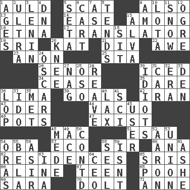 ACROSS 1. Old (Scot.) 5. Get outta here! 9. In addition 13. Small, secluded valley 14. Relaxation 15. Amid 16. Inactive volcano in Sicily 17. Interpreter 19. Indian title of respect (Mr.) 20. Krazy ___ of comics 21. HTML Container Element 22. Deep reverence 23. At once, immediately (arch.) 25. R.R. building 26. Sir (Sp.) 30. On the rocks 34. Stop 35. Have the gumption 36. Pale green bean 39. Purposes of endeavors 42. SW Asia republic 43. Baltic tributary 44. In a vacuum (with "in") 46. Cooking vessels 47. Have an existence 48. Apple computer (short form) 51. Son of Isaac 54. Chief or king in Benin or Nigeria 57. Environmental prefix 58. Title for a knight 60. Santa ___, CA 62. Homes 65. Indian titles of respect 66. Place in a line 67. Adolescent 68. "Silly old bear" 69. "Two Mules for Sister ____" 70. Stupid person 71. Singer Murray DOWN 1. Ripens 2. Extremist 3. Soviet premier 1918-24 4. Heredity factor (abbr.) 5. Bristle 6. Draw slowly or heavily 7. White ___ sheet 8. Watches over 9. Wet nurse (var.) 10. Globular water bottle used in Asia 11. Frozen precipitation 12. Legendary monster 15. Inventor's middle name 18. Be seated 20. Leg joint 24. Motion picture awards 27. Tired old horse 28. Bear (Spanish) 29. Rob, plunder, or pillage 30. Foolish or stupid persons 31. Automobile 32. Epoch 33. Lair 36. Chop off 37. Wedding promise 38. Was introduced to 40. Not strict 41. _-fi 45. One who makes use of a thing 48. Ancient Persian 49. Adept person 50. Continued (abbr.) 52. Composer Copland 53. The state of being joined or united 54. Mouths or openings 55. Actor Lugosi 56. SW Saudi Arabia district 58. Stitch closed the eyes of (a falcon) 59. Is not 61. American tennis player Robert 63. _ tizzy (2 wds.) 64. Corporate head (abbr.) 65. Health resort