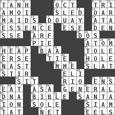ACROSS 1. Hyperbolic tangent 5. Sep. follower 8. Three (prefix) 11. Mine, in Marseilles 12. Downhill vehicle 14. Rowing implement 15. Women servants 17. A city in N France, SE of Calais 18. "One Day ___ Time" 19. Center 21. Compass dir. 22. Lair 23. Compass dir. 24. Sandy's bark 25. Two (Sp.) 27. Sliced dessert 28. Tiny particle 31. Pile 35. Sound made by sheep 37. Lacquered or enameled metalware 38. Celtic language 39. Make a knot 41. Hollow 42. Political cartoonist Thomas 43. Madame (abbr.) 45. Narrow board 46. Disorderly outburst 47. Biblical high priest 49. Be seated 51. _ de Janeiro 52. Followers of ems 55. Consume 57. White ___ sheet 60. Commissioned military rank 62. Heredity factor (abbr.) 63. Instruction Manual for Humans 65. Before Barbara or Clara 66. Electrically charged atom 67. Not divided or shared with others 68. Thailand, formerly 69. Make lace 70. Fish or hair follower 71. Snakelike fish DOWN 1. Domesticates 2. Collect or gather 3. Annoying sound 4. Flintstone garb 5. Bear (Spanish) 6. A slight indication 7. Beverages made from leaves 8. Inedible or poisonous agaric 9. Pace 10. SW Asia republic 13. Colored 16. Fastener 17. Outscore 20. Baby bed with high sides 26. Curses 29. Rounded earthenware pot or jar 30. Confront 31. Coop moms 32. Part of Q.E.F. 33. Helper 34. _ dish (used to culture cells) 36. Direct toward a target or goal 40. Develop 44. Writer Wiesel 48. Charged atoms 50. Bar bills 52. Bert's buddy 53. Brizilian seaport 54. Shuts with force 55. Prepare for publication 56. Small Philippine buffalo 58. The Jewish people; Israel 59. Competent 61. Relaxation 64. Allow