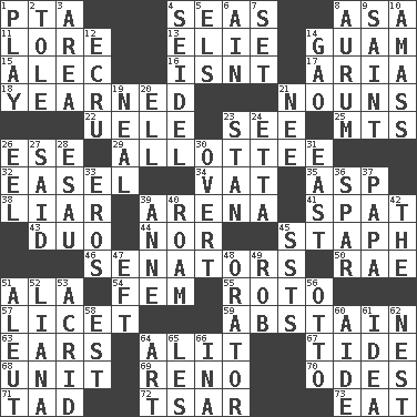 ACROSS 1. Parent Teacher Association (abbr.) 4. Oceans 8. White ___ sheet 11. Old wives' tales, e.g. 13. Writer Wiesel 14. Island territory of the United States 15. Actor Baldwin 16. Is not 17. Operatic vocal solo 18. Had a strong desire 21. Parts of speech 22. Ubangi River tributary 23. Observe 25. Mountains (abbr.) 26. Compass dir. 29. One to whom something is allotted 32. Artist's stand 34. Large container 35. Cleo's killer 38. One who doesn't tell the truth 39. Sports stadium 41. Argument over a trivial matter 43. Superhero pair 44. Not either 45. Staphylococcus 46. Legislators 50. Actress Charlotte 51. Chicken ___ king 54. Opposite of masc. 55. Printing process, for short 57. It is permitted: Lat. 59. Choose not to consume 63. Hearing organs 64. Came down and settled, as after flight 67. Periodic rise and fall of the sea level 68. A single undivided whole 69. Former U.S. Attorney General Janet 70. Lyric poems 71. Small amount or degree 72. Russian ruler of old 73. Erode DOWN 1. Live dramatic performance 2. Lacquered or enameled metalware 3. Type of rug 4. A glass for beer 5. Raised railways 6. The 18th letter of the Arabic alphabet 7. Put into a specified state 8. Gold (Symbol: Au) 9. Virtuous person 10. Collect or gather 12. Shade of tan 14. E Mali city 19. Be tempered by heat 20. Pipe bend 21. Born 23. Comedian Laurel of Laurel & Hardy 24. Singer James 26. Snakelike fish 27. Stated 28. Son of Isaac 30. Unconcealed 31. Compass direction 33. Greek god of love 36. Coast Guard woman 37. Dad 39. Queen of England 1702-14 40. Wander aimlessly 42. Definite Article 45. Fast planes 47. Lizard (obsolete) 48. Speaker 49. Director Reiner 51. Native American of Southwest Alaska 52. Climbing, woody, usually tropical vines 53. Sour-tasting 56. "Beetle Bailey" pooch 58. Eastern Standard Time (abbr.) 60. Assistant 61. The main thing one is thinking about 62. Egg locale 64. Nonscientific branch of learning 65. French article 66. _ tizzy (2 wds.)