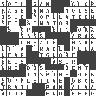 ACROSS 1. Land 5. Separate the seeds from cotton 8. Hoof sound 12. To erase 13. Santa ___, CA 14. Annoying sound 15. Small island 16. Census information 19. Observe 20. Legislator 21. Cease 23. And so on (abbr.) 24. Mouth or opening 27. Backtalk 30. Caspian sea tributary 31. Make 34. Cause to be 35. Singer James 38. Barter 40. Entreaty 41. Letter starter 42. Disregard 44. Snakelike fish 45. SW Saudi Arabia district 46. Compass dir. 47. Two (Sp.) 50. Incision 53. Heighten or intensify 57. Globe 59. Supplementary 63. Mitch Miller's instrument 64. Get behind 65. Baking dish 66. Inventor's middle name 67. Assistant 68. Conclusion 69. Nourish DOWN 1. Indian titles of respect 2. Fertile tracts in a desert 3. Small island 4. Area sheltered from the wind 5. Yawn 6. Soon (poet.) 7. California wine valley 8. Small bed 9. Cards in a Roman deck? 10. Bear (Spanish) 11. Fenced enclosure 14. Drug cop 17. Shoshoni 18. Car dealer's back yard 20. Practice fight 22. Motion picture awards 24. Relating to the mouth 25. Immoral or dissolute person 26. Toward the sea 28. Put into a specified state 29. Indian skirt 30. Electrical Unit 32. Label 33. Pulitzer Prize-winning author Ferber 35. Paradise 36. Adolescent 37. Story 39. Greek goddess of the dawn 43. Travel on or in a vehicle 47. Deli pickle 48. Single 49. Fast jet (abbr.) 51. Impressive in appearance 52. Collection of objects 54. Corncob 55. "Terrible" tsar 56. Tear apart 58. Necklace unit 59. R.R. building 60. RI univ. 61. Groovy apt. 62. Sliced dessert 63. Clumsy lout
