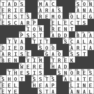ACROSS 1. Bits 5. Big _ 8. Manchild 11. 4th largest of the Great Lakes 12. Ancient river in northeast Turkey 14. Santa ___, CA 15. Trials 17. San ____ (Riviera town) 18. Cassini of fashion 19. Fortification 21. Opts 23. Electrically charged atom 25. Monthly bill 26. Inconspicuous attention getter 27. Find the sum of 28. Sound made by sheep 31. Federal power corp. 33. Teat (slang) 35. Any of the three canals of the cochlea 37. Passed on 38. "Barney Miller" actor Jack 40. Roberta Peters solo 41. Ascend 43. E Mali city 45. Fast jet (abbr.) 46. Benjamin's nick name 47. Zeal 50. Long journey 52. We are 53. Possessed 54. College paper 56. Sounds asleep 61. Went for two points 62. Fast planes 65. Having winglike extensions 66. Snakelike fish 67. Pile 68. Actor's bit 69. Sight organ 70. R.R. building 71. Of or related to the anus DOWN 1. Wig 2. Ancient Greek god of war 3. Flat circle 4. Stalk of a moss capsule 5. Third mo. 6. "We ___ not amused" (Victoria) 7. Device for capturing images 8. Table seasoning 9. Singles 10. Tired old horse 13. Having a sole or soles 16. Indian titles of respect 18. Sep. follower 20. Mail 22. Extremities 24. Nuclear Threat Initiatives 26. Writing tablets 28. Drinking establishments 29. Set down 30. American Automobile Association (abbr.) 31. Hoop that covers a wheel 32. Distinctive style or manner 34. Coat; cloak 36. Keg 37. Small moist lump or mass 39. Pledge 42. Nights before holidays 44. Mouths or openings 48. From or relating to Ireland 49. Makes clutter 51. Pulitzer Prize-winning author Ferber 52. Soggy 54. Those things 55. Hollow 57. Water jar 58. Water falling in drops from the sky 59. Inactive volcano in Sicily 60. Sew up the eyelids of hawks and falcons 61. Perceive with the eye 63. Make lace 64. Health resort
