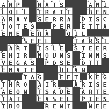 ACROSS 1. Electrical Unit 4. Floor protectors 8. Black tropical American cuckoo 11. Hang loosely or laxly 13. Distinguishing feature 15. Benjamin's nick name 16. Like ___ of sunshine 17. Spanish missionary in California 18. Flat circle 19. Lugs 21. For each 22. Singer James 23. Compass dir. 24. Epoch 27. Petroleum 29. Stitch closed the eyes of (a falcon) 30. Tarsus (plural) 34. Tate display 36. Capri or Wight 39. Navigate 40. Arab leader 41. Parts of speech 43. Lodging establishments 44. Viva Las _ 46. Airs 47. Baseball player Mel 48. Related on the mother's side 49. ____ Bator 51. Label 53. Bank Draft (abbr.) 54. Barrel 57. Through, poetically 60. Wind 63. Get up 65. A really long time 66. Sadhe (variant) 69. Johnson of "Laugh-In" 70. Make lace 71. Artist's stand 72. Sliced desserts 73. Wedding promise 74. Painter Guido (1575-1642) 75. Born DOWN 1. Having winglike extensions 2. Person of subnormal intelligence 3. Food holder 4. Mountains (abbr.) 5. "We ___ not amused" (Victoria) 6. Canvas cover 7. Male parent of an animal 8. "This won't hurt ____!" 9. A home for chicks 10. South American Indian 12. Sodium hydroxide 14. Pacific island yam 18. Accusation by an informer 20. Observe 25. It's straight from the horse's mouth 26. Columnist Joseph or Stewart 28. It is 29. Ski resort town in Vermont 31. Monthly bill 32. Emitted 33. Big collection agency 34. So be it 35. Port city in Latvia 37. Nilotic language 38. Take place subsequently 40. Night before a holiday 42. Automatically 45. Ocean 50. _ moment's notice (2 wds.) 52. Yard entry 54. Japanese brewing company 55. First name in cosmetics 56. Honkers 57. Jacques of French films 58. Froth on beer 59. Printing process, for short 61. Austrian river, tributary to the Danube 62. Raze (variant) 64. Reproach for some lapse or misdeed 67. Lair 68. Connecticut Ivy Leaguer