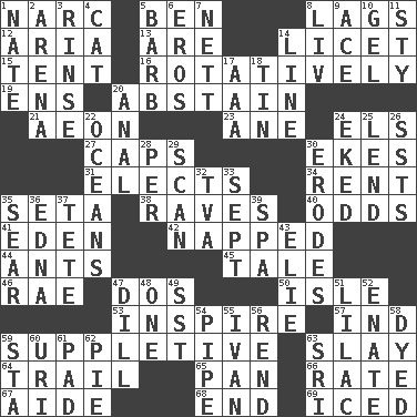 ACROSS 1. Drug cop 5. Benjamin's nick name 8. Falls behind 12. Roberta Peters solo 13. "We ___ not amused" (Victoria) 14. It is permitted: Lat. 15. Portable shelter 16. Rotating or pertaining to rotation 19. Followers of ems 20. Refrain by choice 21. A really long time 23. A saturated hydrocarbon 24. Raised railways 27. Balmoral and tarboosh 30. Makes supply last 31. Chooses 34. Monthly bill 35. Stalk of a moss capsule 38. All-night dance parties 40. Likelihood 41. Genesis locale 42. Slept 44. Pismires 45. Story 46. Actress Charlotte 47. Two (Sp.) 50. Small island 53. Stimulate to action 57. Working for oneself (abbr.) 59. Supplying deficiencies 63. Kill 64. Drop behind 65. Baking dish 66. Pace 67. Assistant 68. Conclude 69. On the rocks DOWN 1. Nathan's nickname 2. Sports stadium 3. Remove soap 4. Domesticated feline 5. Sharp remark 6. Greek god of love 7. Remaining after all deductions 8. 54 in ancient Rome 9. Adept person 10. Set 11. Filthy place 14. Actor's bit 17. Auto club (abbr.) 18. Shallow baking pan 20. Of or related to the anus 22. Seas 24. Made supply last 25. Grant temporary use of 26. Fast planes 28. For each 29. Glance over 30. Eats (away) 32. Federal power corp. 33. Back-to-school mo. 35. Shrivel 36. Pulitzer Prize-winning author Ferber 37. Wig 39. Health resort 43. Writer Wiesel 47. Deli pickle 48. Single 49. Fast jet (abbr.) 51. Pale purple color 52. Related on the mother's side 54. Corncob 55. _ the terrible 56. Tear apart 58. Colored 59. R.R. building 60. RI univ. 61. Writing tablet 62. Sliced dessert 63. _ Lanka